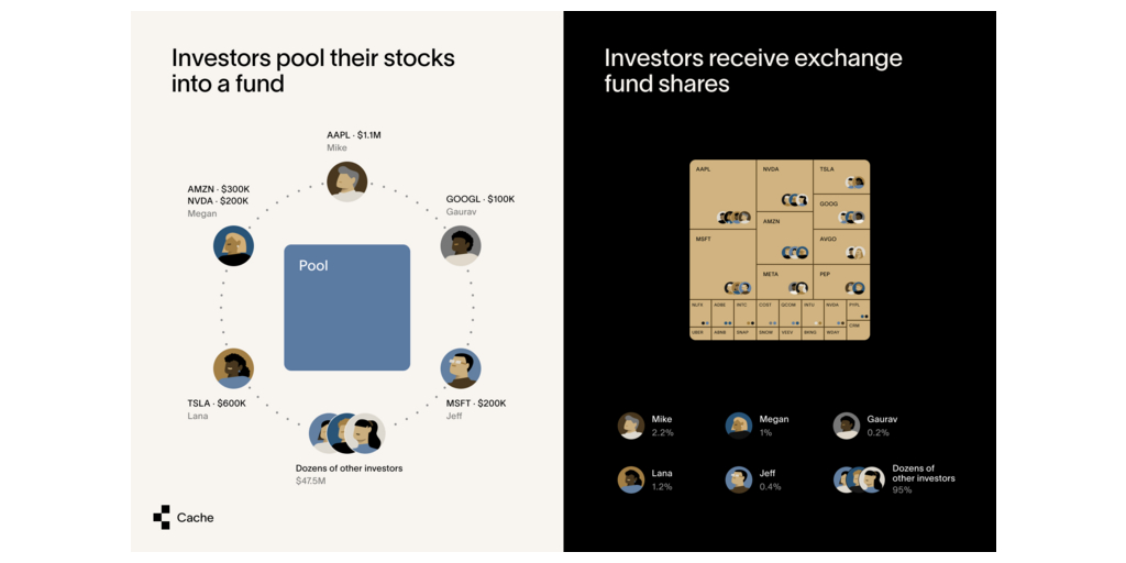 Cache's modern exchange funds allow investors to swap concentrated stock positions for diversified portfolios tracking major indices like the Nasdaq-100 and S&P 500, while deferring capital gains taxes until they choose to sell. The platform requires just $100,000 minimums compared to traditional exchange funds' million-dollar requirements, and charges competitive fees of 0.4-0.95% versus the 1.5-2.25% typical of legacy providers.