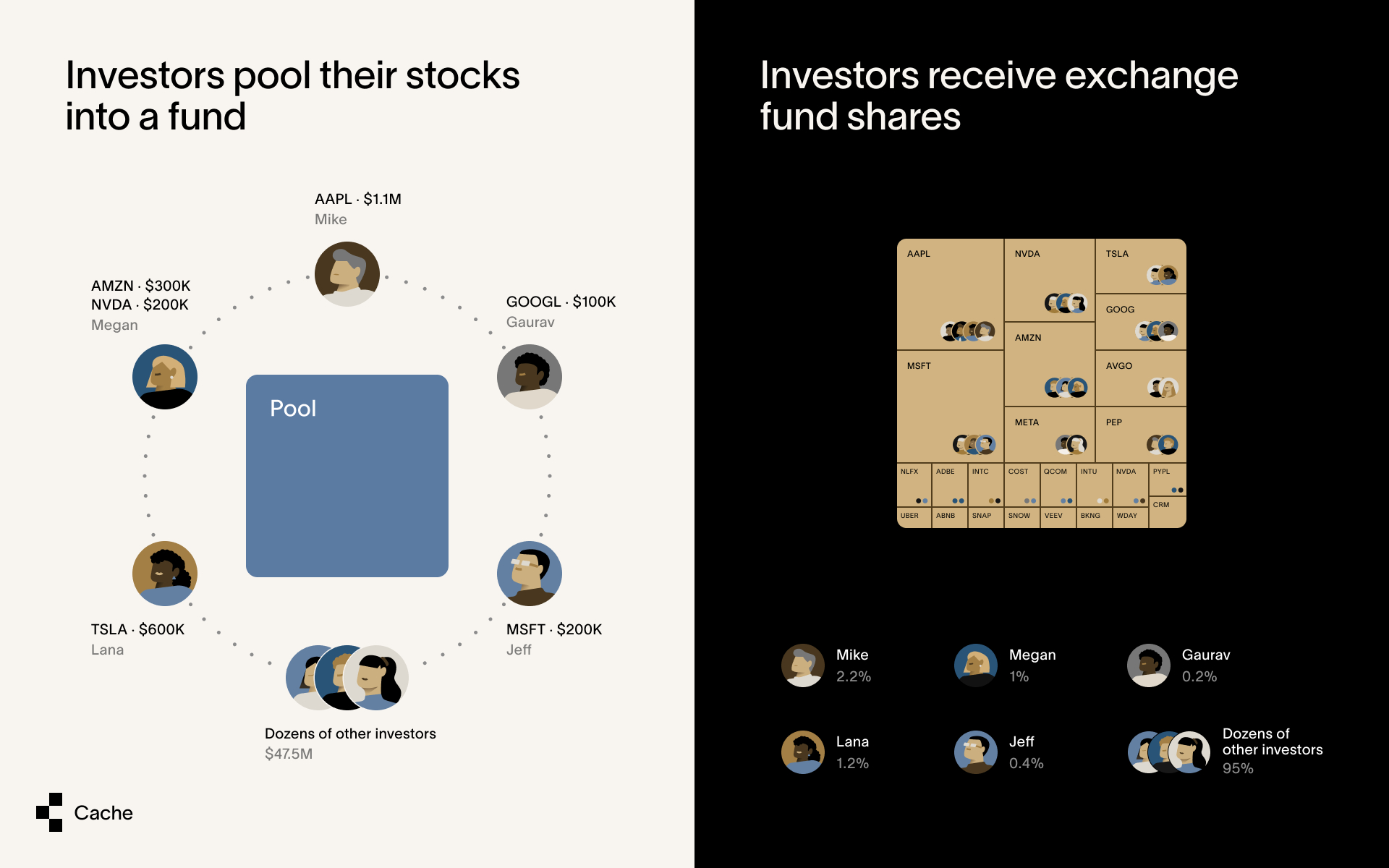 Cache's modern exchange funds allow investors to swap concentrated stock positions for diversified portfolios tracking major indices like the Nasdaq-100 and S&P 500, while deferring capital gains taxes until they choose to sell. The platform requires just $100,000 minimums compared to traditional exchange funds' million-dollar requirements, and charges competitive fees of 0.4-0.95% versus the 1.5-2.25% typical of legacy providers.