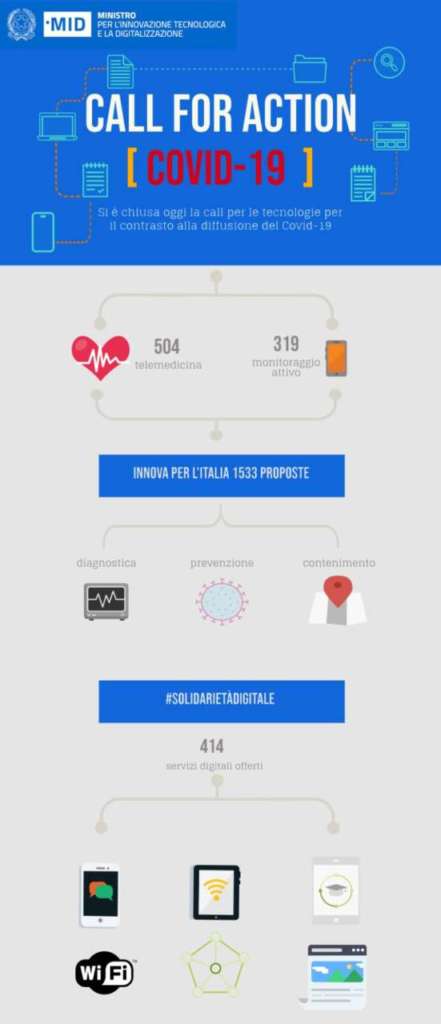 Il ministero diretto da Paola Pisano aveva chiesto, insieme al Ministero della Salute e all’Istituto Superiore di Sanità in collaborazione con l’Organizzazione Mondiale della Sanità, al mondo dell’impresa e della ricerca italiano di proporre le proprie soluzioni digitali disponibili relativamente ad app di telemedicina e assistenza domiciliare dei pazienti e a tecnologie per il monitoraggio attivo del rischio di contagio.