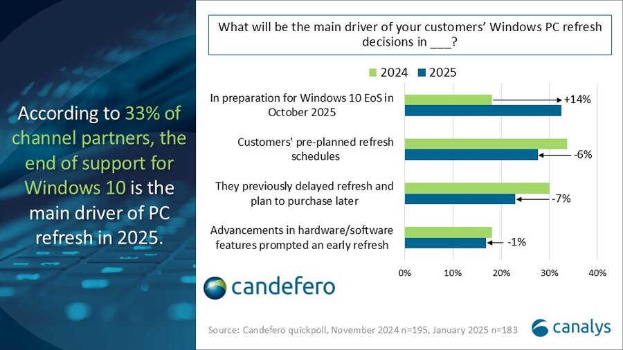 “Con l’avvicinarsi della scadenza per la fine del supporto di Windows 10, questo sta emergendo come il principale catalizzatore di refresh tra i partner“, ha dichiarato Jessop. Secondo un sondaggio condotto a gennaio tra i partner di canale, un terzo ha citato Windows 10 EoS come il principale fattore di decisione per il refresh dei loro clienti nel 2025. “Molti di questi partner prevedono che la maggior parte dei refresh dei loro clienti avverrà nella seconda metà del 2025“, ha aggiunto Jessop.