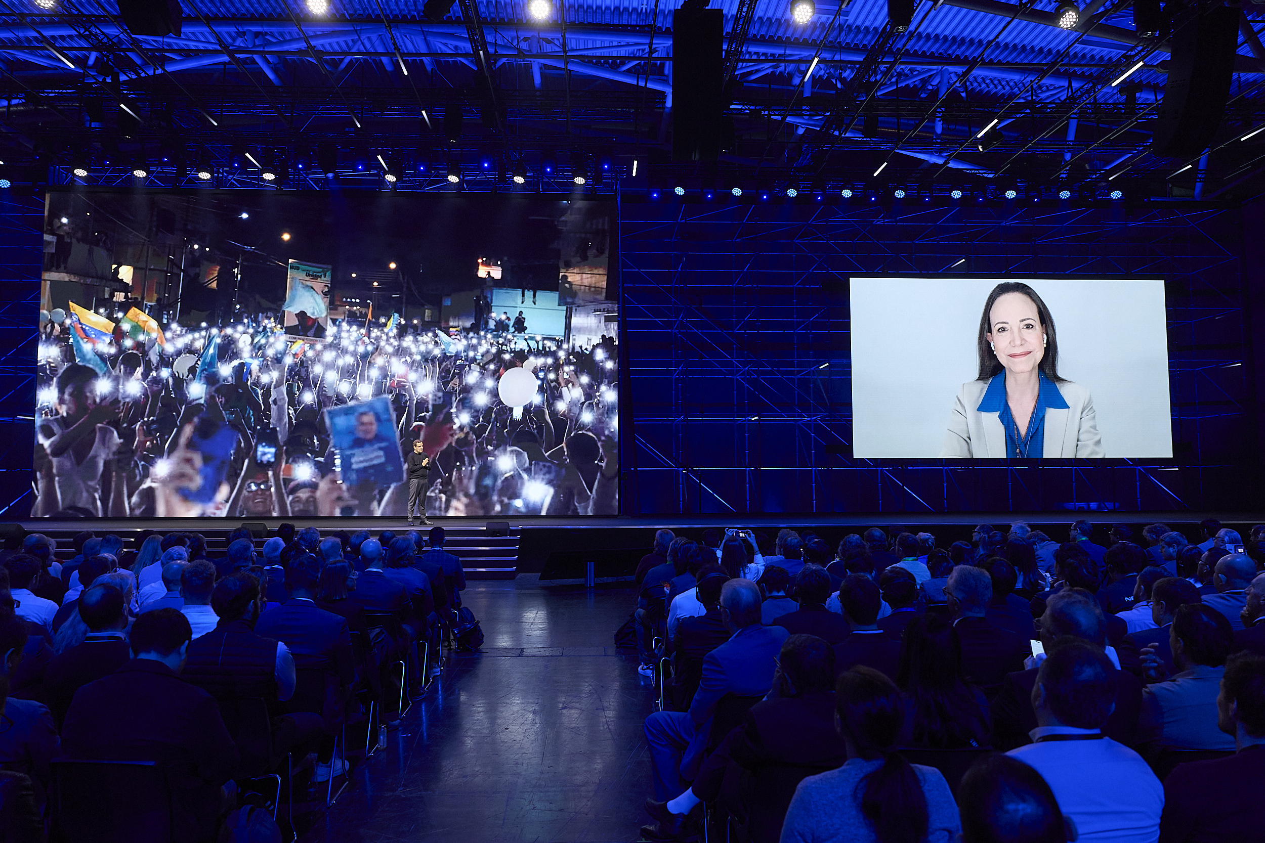 Sul palco virtuale è intervenuta María Corina Machado, premio Nobel per la Pace 2025, collegata in diretta dal Venezuela, introdotta dalla figlia Ana Corina Machado, oggi parte del team Celonis.