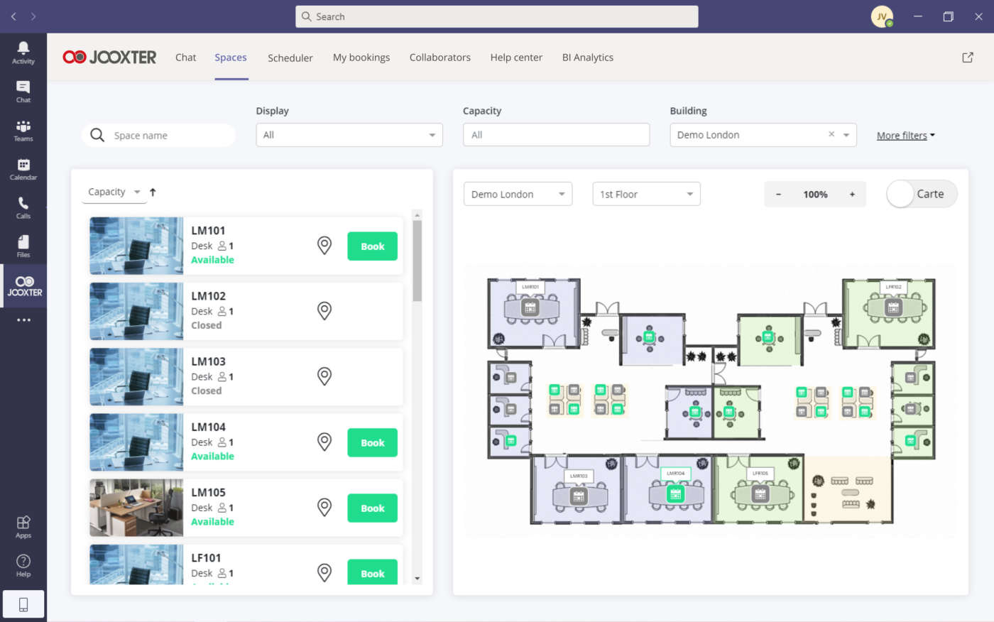 Innanzitutto focalizzandosi sul lavoro ibrido: Jooxter fornisce una chiara visibilità degli edifici, degli uffici e delle risorse (come ad esempio le sale riunioni, per videoconferenze e così via), fornendo una piattaforma dinamica per la collaborazione in team.