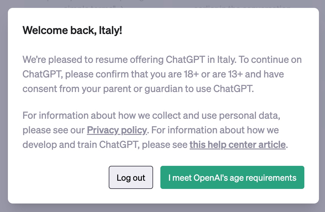 Welcome back, Italy! Così gli utenti che accedono a ChatGPT dall’Italia sono accolti al momento del collegamento, con una richiesta di conferma dell’età – superiore a 18 anni o a 13 con consenso di un genitore – e un link alla Privacy Policy. OpenAI ha quindi soddisfatto in buona parte alle richieste del Garante della Privacy, che lo annuncia ufficialmente in un comunicato stampa, elencando le richieste alle quali l’azienda ha già ottemperato. Al di là degli adempimenti formali previsti dal Gdpr, ovvero la pubblicazione delle necessarie informazioni sulla modalità di trattamento dei dati, tutelano sicuramente la privacy e la reputazione di tutti gli utenti alcune innovazioni che il Garante elenca: