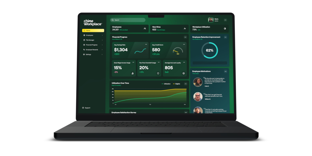 Chime Workplace provides employers with a centralized platform that simplifies benefits administration while boosting employee participation. Employers gain aggregated and measurable insights into the financial health of their employee base—such as savings growth, credit health improvement, and overall engagement—through a centralized data portal.