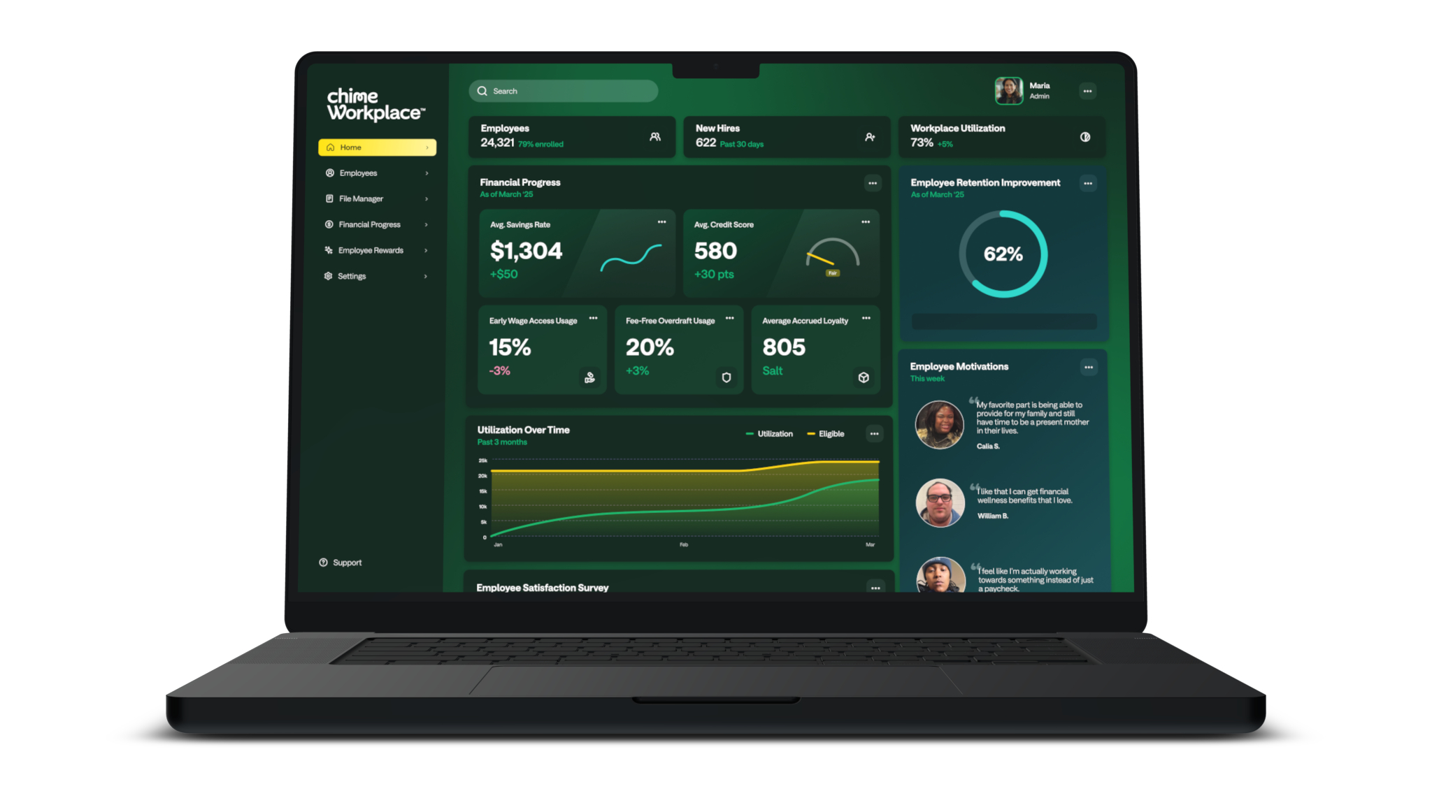 Chime Workplace provides employers with a centralized platform that simplifies benefits administration while boosting employee participation. Employers gain aggregated and measurable insights into the financial health of their employee base—such as savings growth, credit health improvement, and overall engagement—through a centralized data portal.