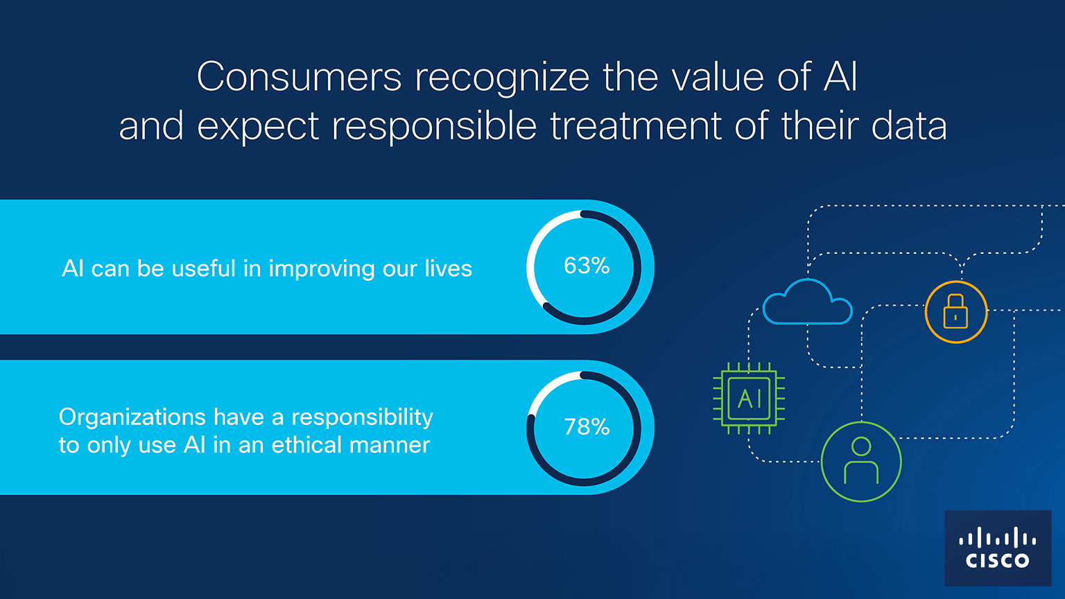 “L’influenza crescente dell’IA nella nostra vita quotidiana richiama l’attenzione sulla necessità di un uso responsabile e sicuro di questa tecnologia,” ha dichiarato Dev Stahlkopf, Cisco’s Chief Legal Officer and Executive Vice President. “Il 78% dei consumatori intervistati ritiene che sia responsabilità delle aziende utilizzare l’IA in modo etico, evidenziando così l’importanza fondamentale della relazione tra IA responsabile e fiducia dei consumatori.”