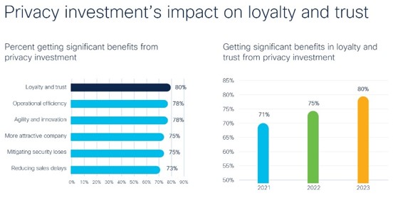 L’80% degli intervistati a livello globale ha indicato di ottenere significativi benefici in termini di “Fedeltà e Fiducia” dai loro investimenti in privacy, e questa percentuale è ancora più elevata (92% a livello globale, 83% in Italia) per le organizzazioni più mature dal punto di vista della privacy.