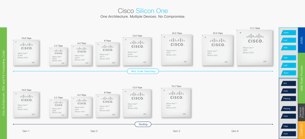 Cisco Silicon One G202 offre vantaggi simili ai clienti che desiderano utilizzare il SerDes 50G per collegare l’ottica allo switch. Si tratta di un dispositivo SerDes a 5 nm, 25,6 Tbps, 512 x 56 Gbps con le stesse caratteristiche del G200  – ma con prestazioni dimezzate.