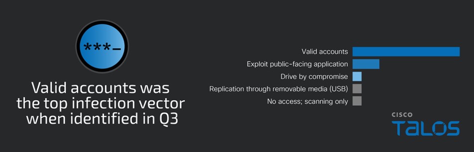Per il quarto trimestre consecutivo, l’accesso iniziale è stato ottenuto principalmente tramite l’utilizzo di account validi, un metodo che ha rappresentato il 66% degli interventi di Cisco Talos. Inoltre, nel 20% delle interazioni, i criminali informatici hanno sfruttato vulnerabilità presenti nelle applicazioni.