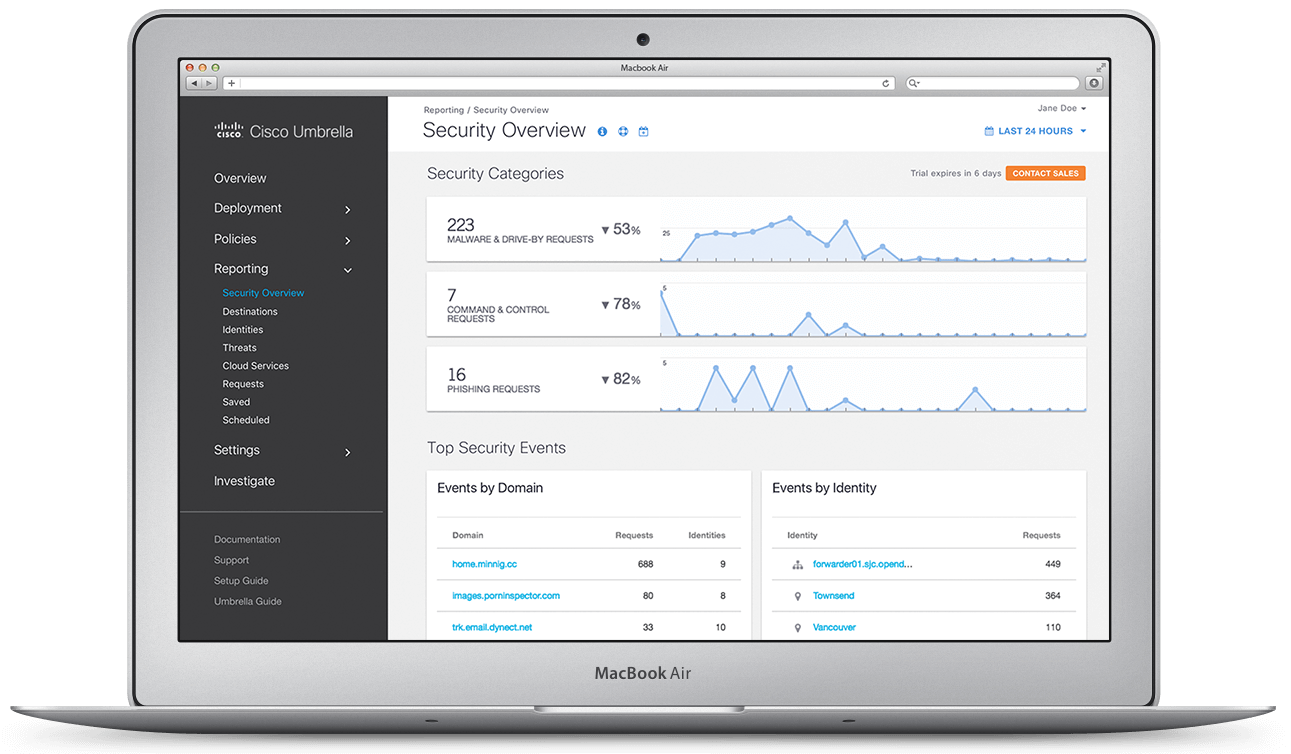 È in grado di risolvere 100 miliardi di richieste Internet al giorno, correlando i dati con più di 11 miliardi di eventi passati. Sfrutta modelli di machine learning per l’individuazione di minacce emergenti, Cisco Thalo Threat Intelligence per bloccare URL maligne, Cisco Advanced Malware Protection.