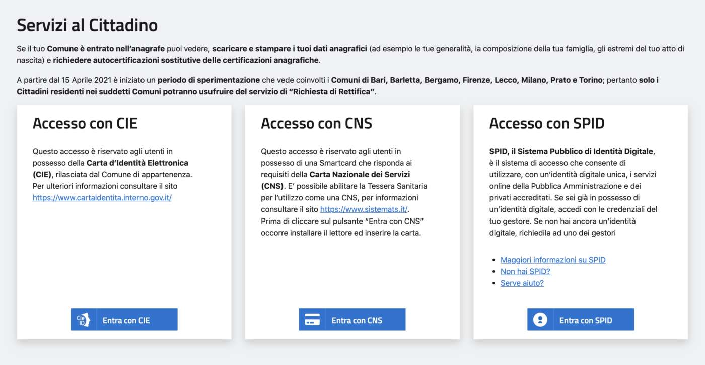 Nell’Area Riservata del sito ANPR, i cittadini in possesso di Carta d’Identità Elettronica (CIE), Carta Nazionale dei Servizi (CNS) o SPID, potranno richiedere la rettifica di uno o più dati inesatti della propria scheda anagrafica, segnalando gli errori materiali o comunicando eventuali integrazioni di dati incompleti.