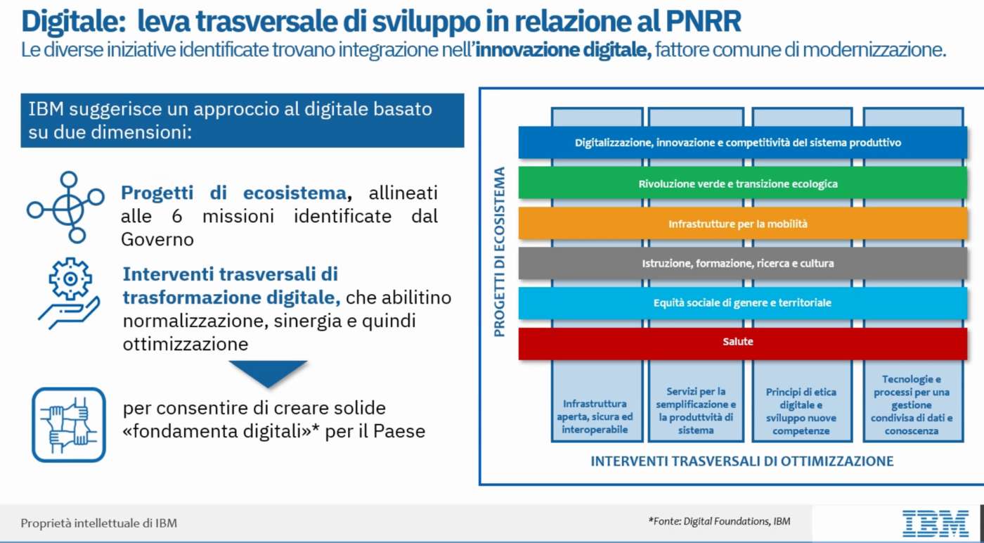 Riguardo il tema del cosiddetto Recovery Plan (da noi chiamato Next Generation IT a simboleggiare il ruolo della tecnologia nel processo di cambiamento del Paese) Ibm ha sviluppato un punto di vista in cui il digitale svolge un ruolo cruciale, anche maggiore rispetto a quello finora scritto dal precedente governo sul piano a sei progetti di ecosistema.