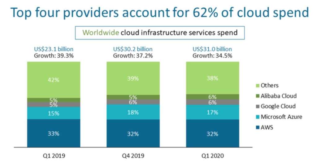 Secondo le ultime rilevazioni di Canalys, infatti, i servizi di infrastruttura stabiliscono ancora un altro record nel primo trimestre 2020, registrando una crescita del 34%, per raggiungere i 31 miliardi di dollari.