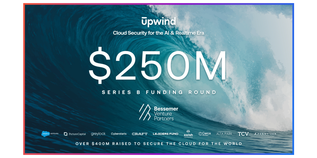 SAN FRANCISCO--(BUSINESS WIRE)--Upwind, the runtime-first cloud security leader, today announced that it has raised $250 million in Series B funding, bringing its total funding to $430 million. The round was led by Bessemer Venture Partners, with participation from Salesforce Ventures and Picture Capital. Existing investors include Greylock, Cyberstarts, Leaders Fund, Craft Ventures, TCV, Alta Park, Cerca Partners, Swish Ventures and Penny Jar Capital. The Series B marks the beginning of what Upwind calls “The Next Wave,” its next phase of growth focused on scaling runtime-first cloud security to enable a new era of AI and real-time cloud applications for enterprises globally.