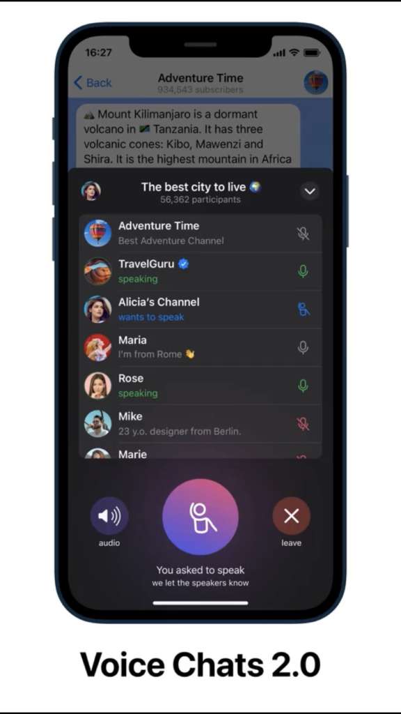 Come amministratori, all’interno di un gruppo o di un canale, è possibile iniziare ora una conversazione audio estesa a un numero illimitato di utenti. Ben oltre gli attuali 8000 previsti dall’applicazione di Paul Davidson e Rohan Seth.