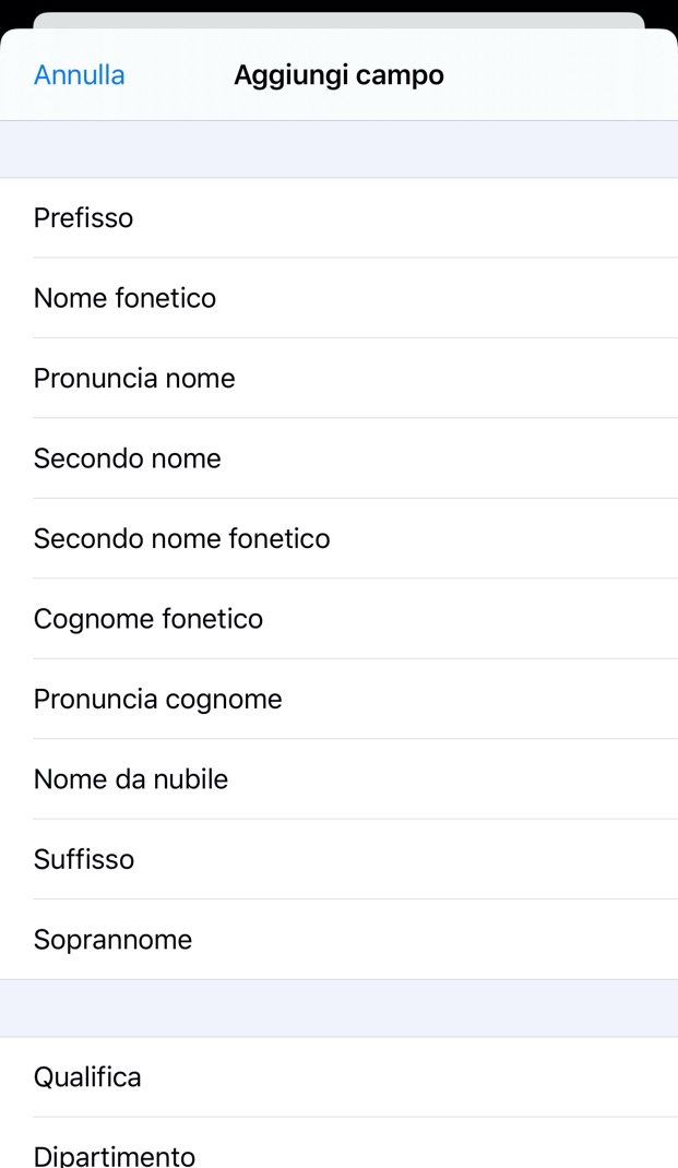 Per sfruttare il campo Soprannome è innanzitutto necessario aggiungerlo alla scheda del contatto per cui desideriamo usarlo, perché non è tra quelli presenti per importazione predefinita nelle schede.