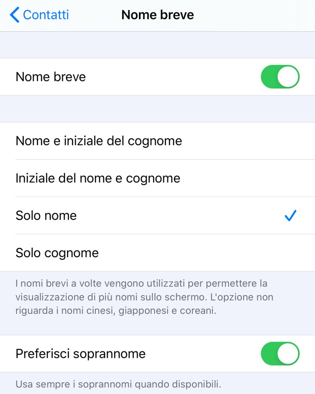 Per attivare questa opzione, apri Impostazioni > Contatti > Nome breve e “accendi” l’interruttore del controllo Preferisci soprannome. iPhone visualizzerà il soprannome se questo è presente per un contatto, nelle app e nelle funzioni che prevedono questa opzione.