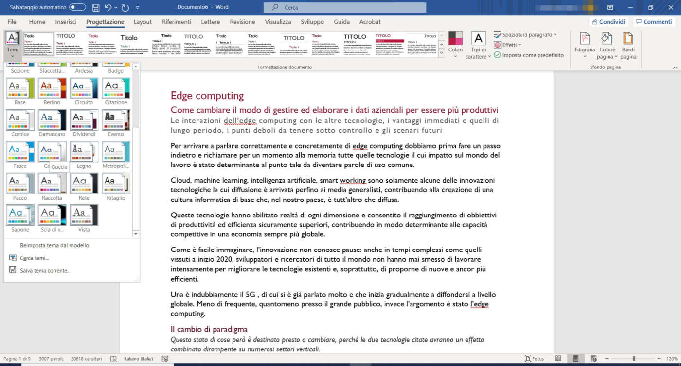 Word visualizza un pannello con una selezione dei temi: la cosa molto comoda è che, passando con il mouse sui temi nel pannello a comparsa, puoi vedere in tempo reale un’anteprima del tema applicato al documento.
