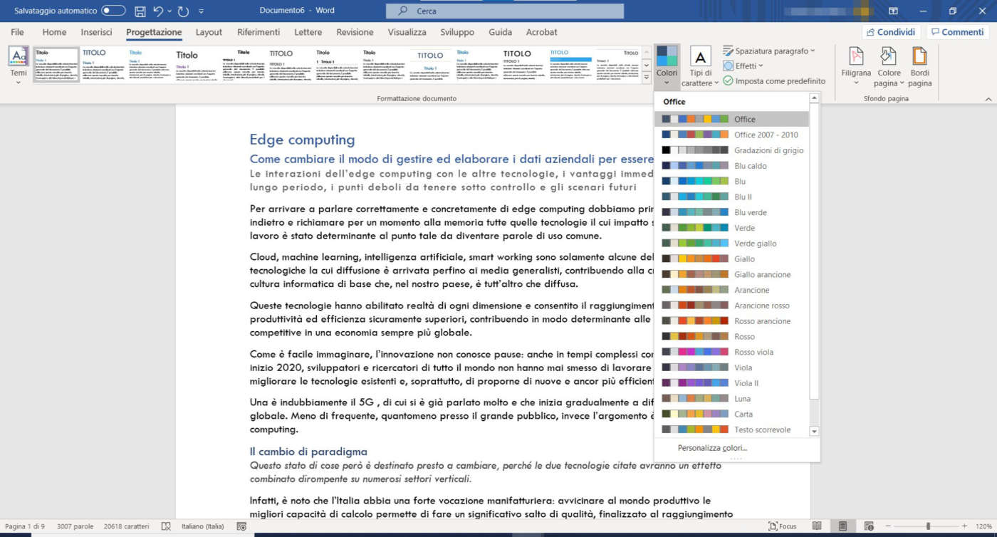 Sempre nella scheda Progettazione, fai clic su Colori. Word visualizza un pannello che presenta una serie di combinazioni di colori coordinati. Anche in questo caso, basta posizionare il puntatore del mouse su una combinazione di colori per visualizzarne subito in anteprima l’aspetto che avrà nel documento.