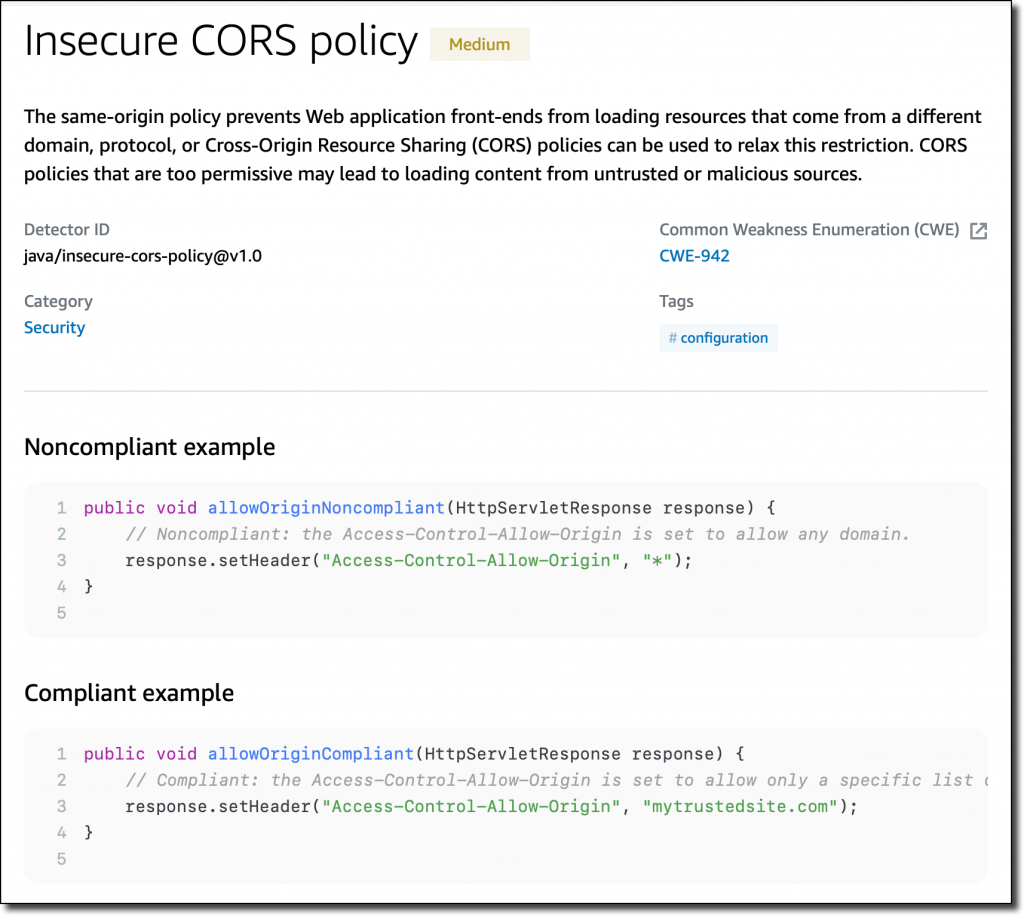 Una nuova Detector Library descrive in dettaglio i rilevatori che CodeGuru Reviewer utilizza quando cerca possibili difetti e include esempi di codice sia per Java che per Python.
