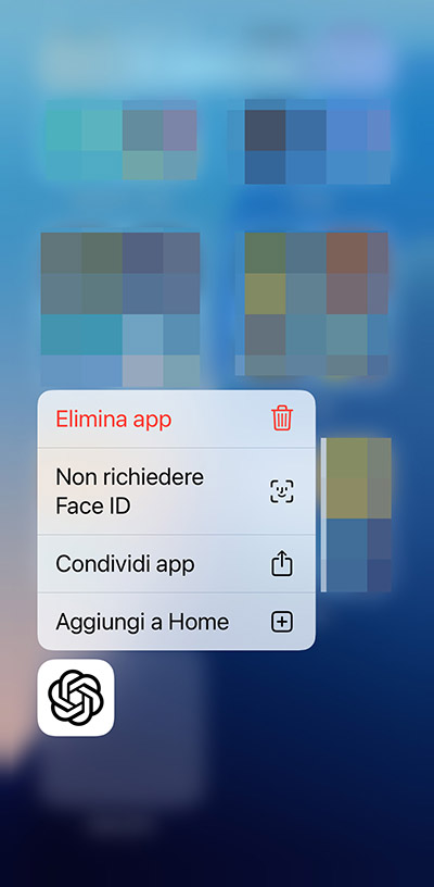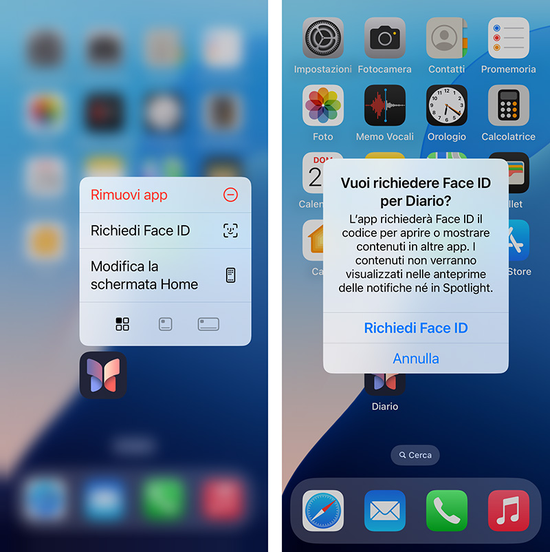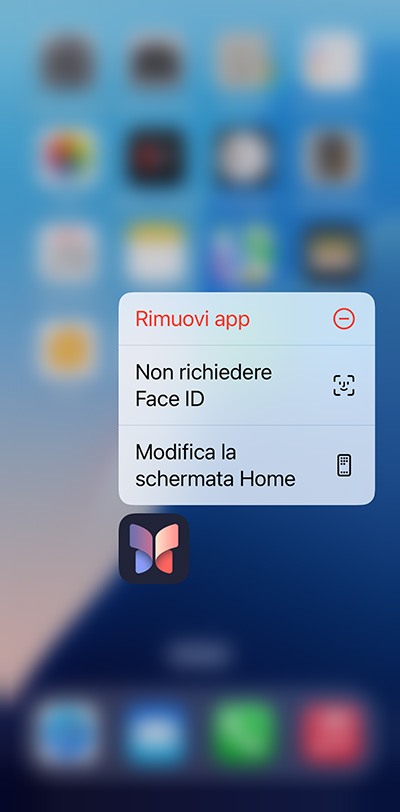 Pertanto, ripetiamo la procedura già vista: individuiamo l’app nella schermata Home; tocchiamo e teniamo premuto sulla sua icona finché non si apre il menu contestuale delle azioni rapide; quindi, tocchiamo sul comando Richiedi Face ID (o Touch ID, o codice, a seconda del caso) del menu contestuale.