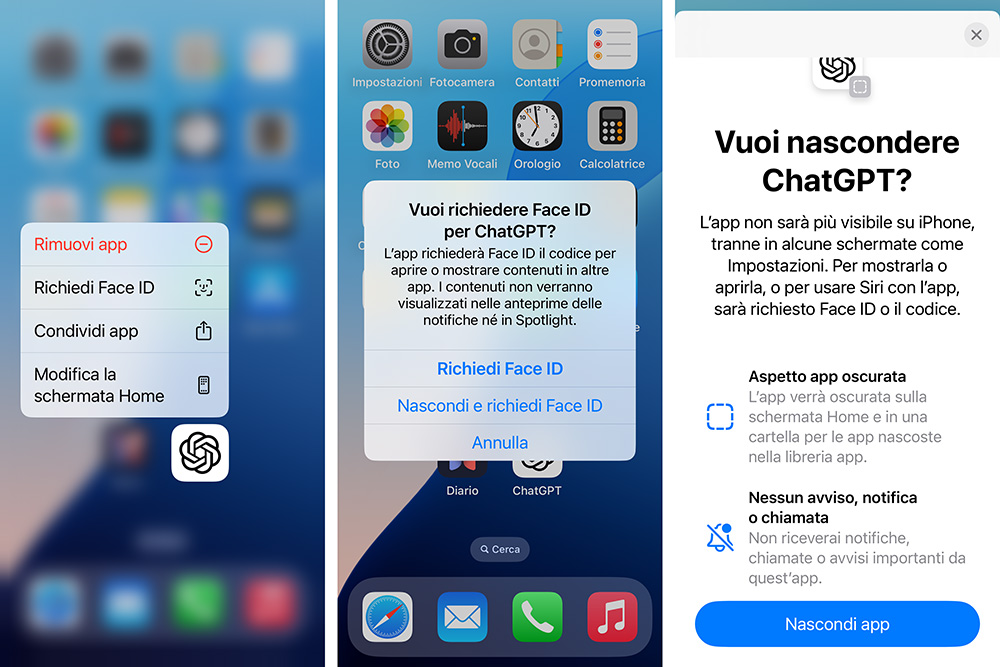 Inoltre, non possono essere nascoste le app integrate in iOS 18, ma solo quelle installate in un secondo momento da App Store. Per questo motivo, cambiamo app per il nostro esempio, e poniamo di voler bloccare e nascondere ChatGPT.