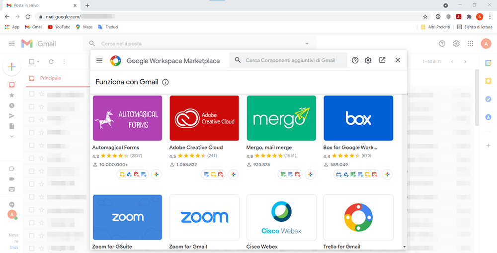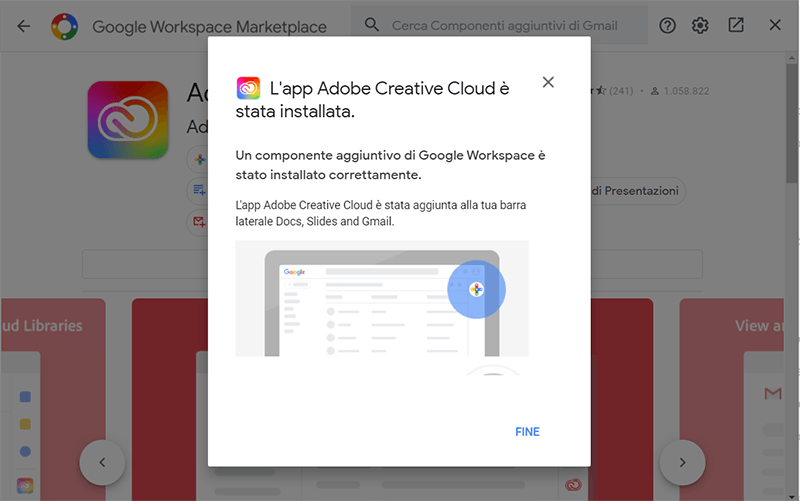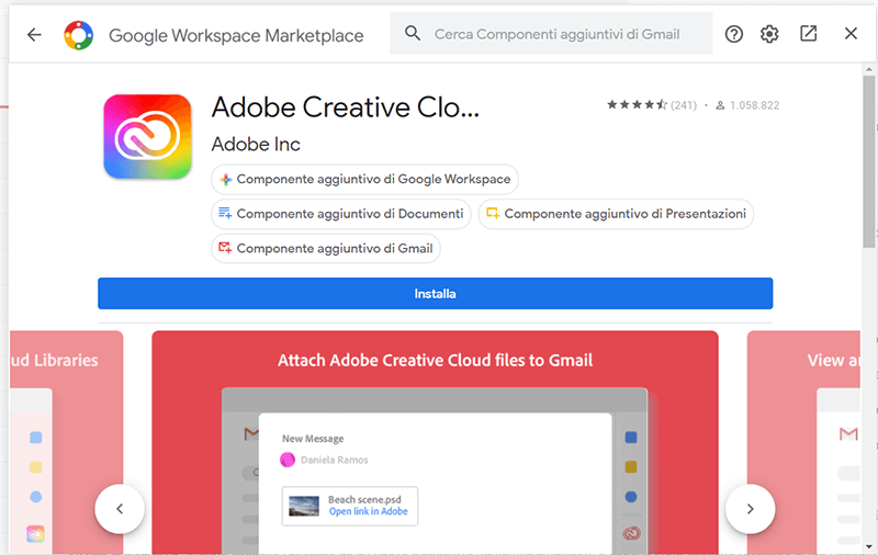 Si apre la schermata del Google Workspace Marketplace. Qui, è probabile che l’add-on Adobe Creative Cloud sia già in evidenza. In caso contrario, cerchiamolo con la casella di ricerca.
