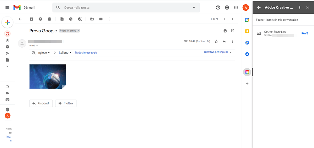 Oltre a permettere di condividere un link, l’integrazione funziona anche in direzione opposta: il componente aggiuntivo Adobe per Google Workspace è anche in grado di rilevare eventuali asset allegati a un messaggio in arrivo di Gmail, per consentire di selezionarli e salvarli su Creative Cloud.