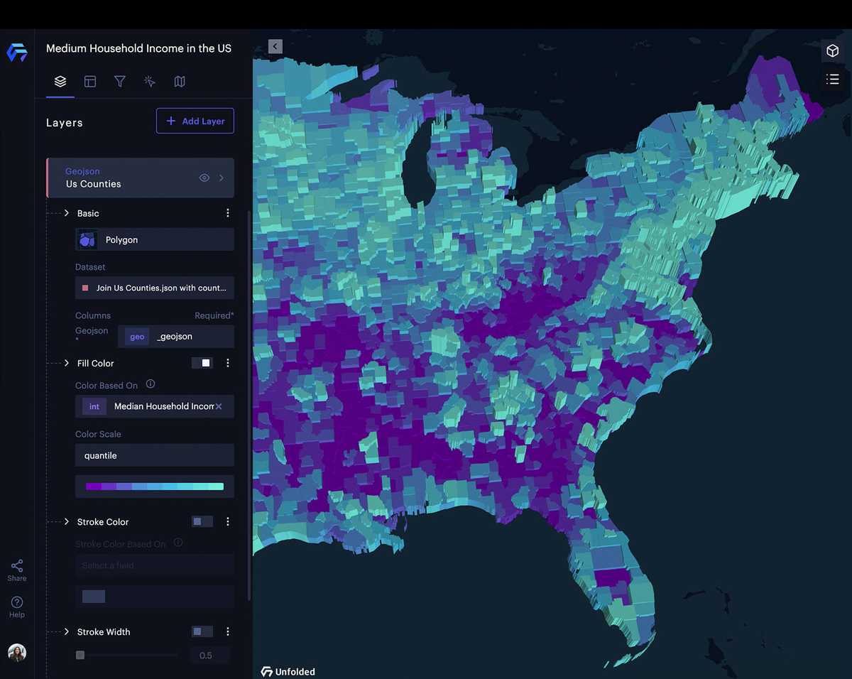 L’obiettivo di Unfolded è quello di consentire l’analisi dei dati geospaziali e temporali senza sforzo su scale enormi e planetarie, e di condividere insight attraverso visualizzazioni geospaziali che ispirano per il loro aspetto e la loro fluidità.