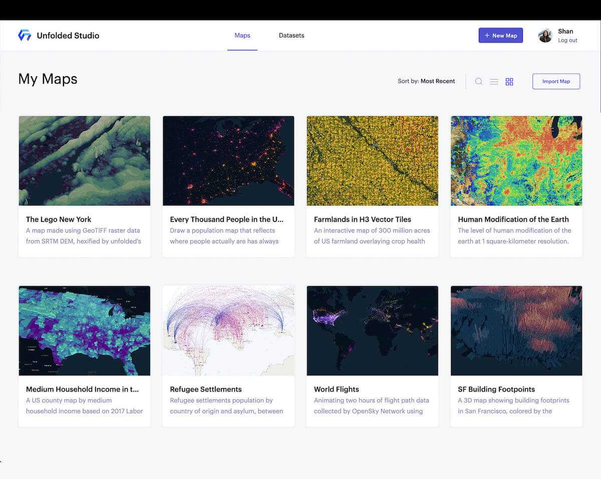 Unfolded Studio fornisce una dashboard per gestire gli asset geospaziali con un’archiviazione cloud sicura, cu cui è possibile copiare, scaricare, eliminare, ordinare o rinominare mappe e dataset e aprirli per la modifica e la pubblicazione. Se non si vuole archiviare i propri dati nel cloud di Unfolded, i clienti enterprise hanno accesso all’SDK Unfolded Data e alle integrazioni back-end che consentono modi alternativi di archiviare e accedere ai dati.