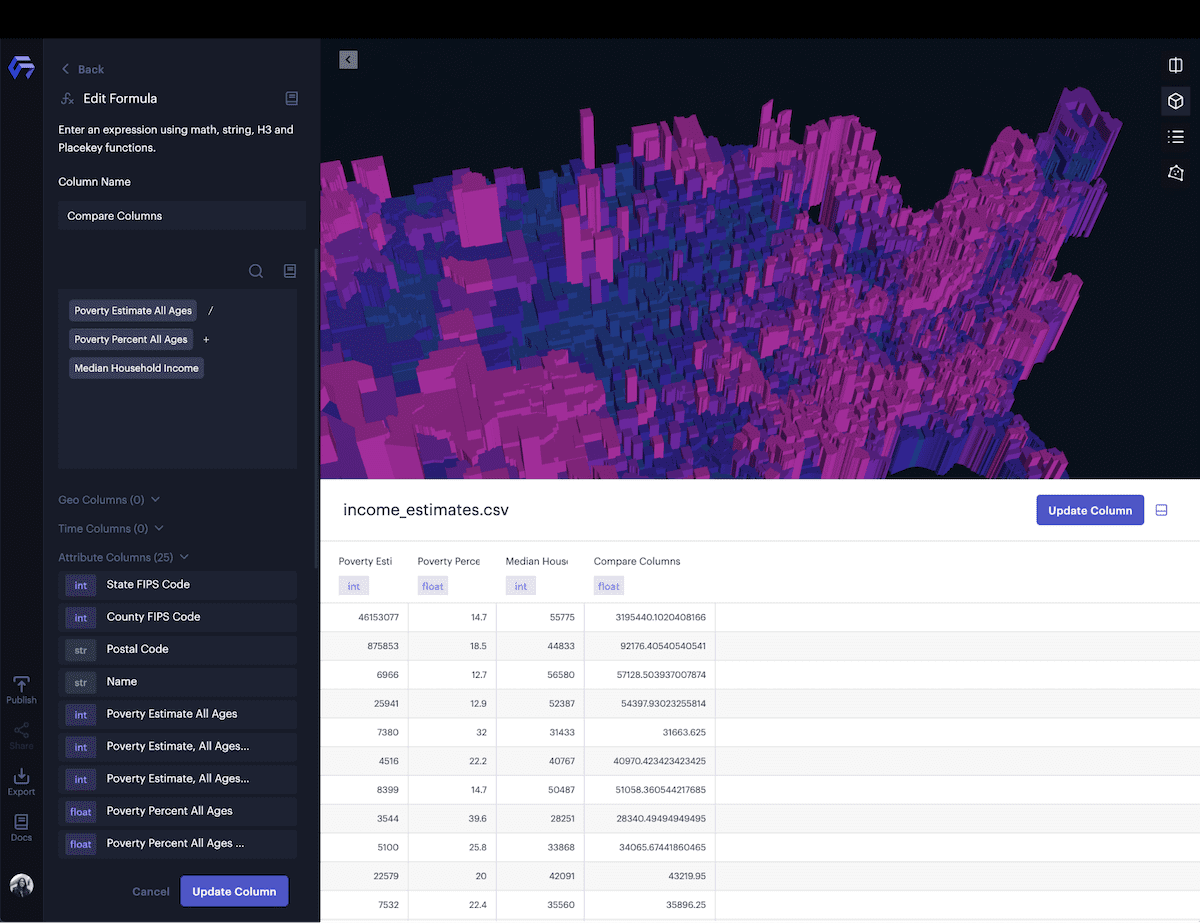 La piattaforma permette agli utenti di passare facilmente dalla preparazione dei dati geospaziali agli approfondimenti con un solo strumento. È possibile definire nuove colonne usando espressioni matematiche con una ricca libreria di funzioni analitiche ed eseguire operazioni in stile SQL come join di tabelle e aggregazioni direttamente nell’interfaccia visuale.