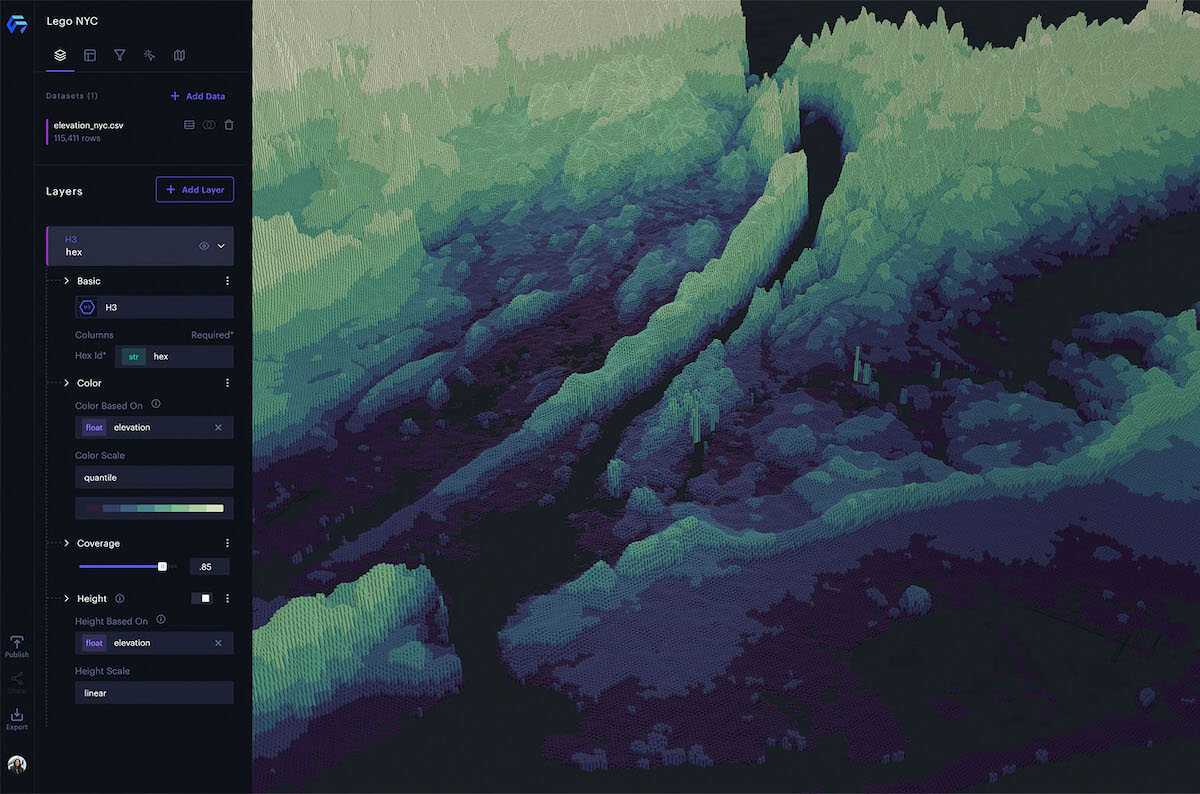 La piattaforma permette di mostrare i dati geospaziali nel contesto delle mappe attraverso un ricco catalogo di layer di visualizzazione. Questi offrono funzionalità potenziate dalla GPU che sono progettate per combinare tecniche di visualizzazione all’avanguardia, una fluidità di livello elevato nonché un tocco artistico che fa emergere la bellezza interiore dei dati e delle mappe, affinché tale rappresentazione possa ispirare intuizioni preziose.
