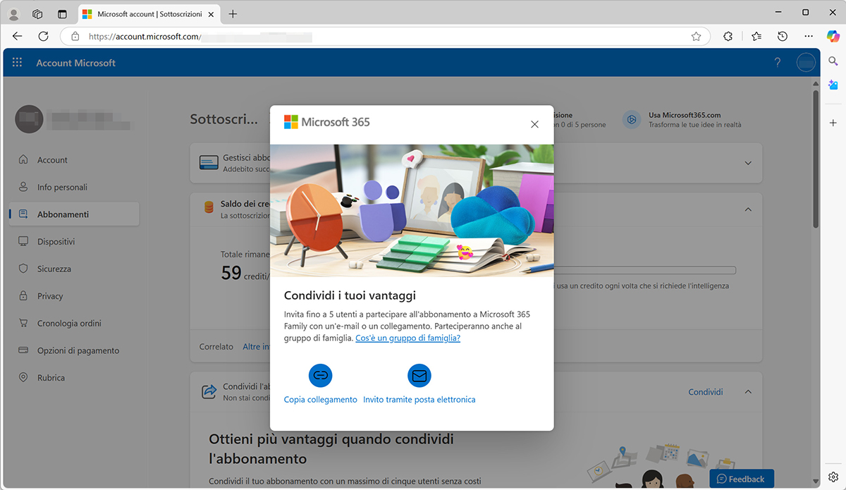 Nell’Account Microsoft, il proprietario dell’abbonamento – come abbiamo visto prima – accede alla sezione di gestione dell’abbonamento e fa clic su Condividi. In questo caso, tuttavia, poi sceglie Copia collegamento.