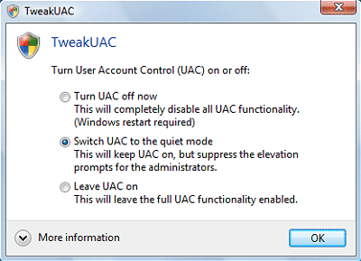 L’opzione Switch UAC to the quiet mode è quella più consigliata perché evita la comparsa dei pop-up di conferma nel momento in cui si sia loggati in Windows Vista con un account dotato di diritti amministrativi.