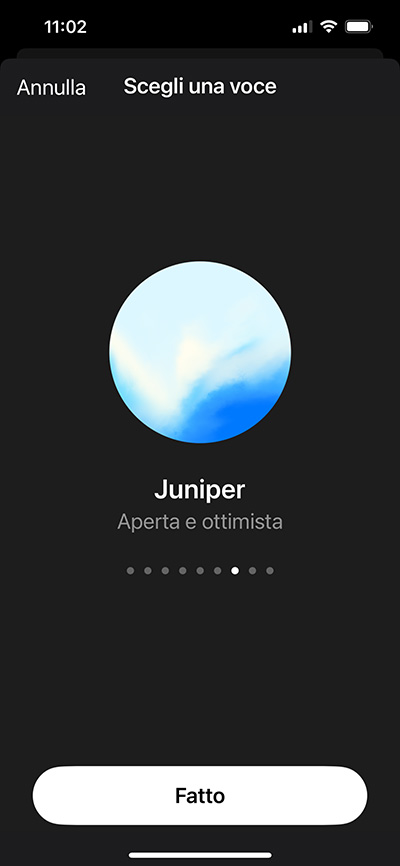 Già da queste anteprime possiamo cogliere il carattere più “umano” della voce avanzata di ChatGPT. Quando abbiamo scelto quella che preferiamo, facciamo tap su Fatto (se non abbiamo selezionato una voce diversa da quella già attiva) oppure Avvia nuova chat (se la voce selezionata è diversa da quella attualmente attiva). Infatti, non si può cambiare voce rimanendo nella stessa chat: per usare una voce diversa, dobbiamo avviare una nuova chat.