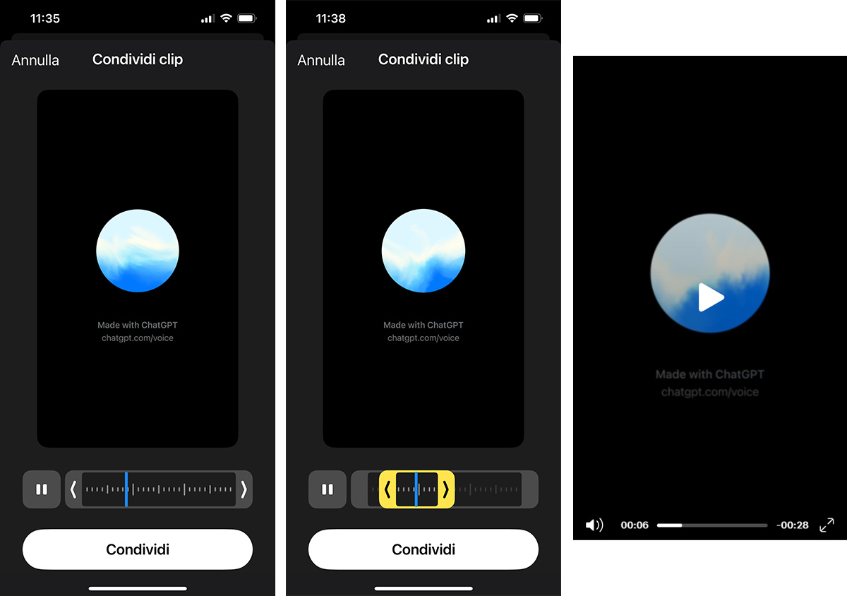 Una cosa che abbiamo notato è che il volume della voce di ChatGPT tra le varie schermate – ad esempio quelle descritte finora: quella della chat, quella di selezione della voce e quella di condivisione del clip video – può avere livelli diversi. Quindi, passando da una all’altra, potrebbe alzarsi e abbassarsi il volume della voce.
