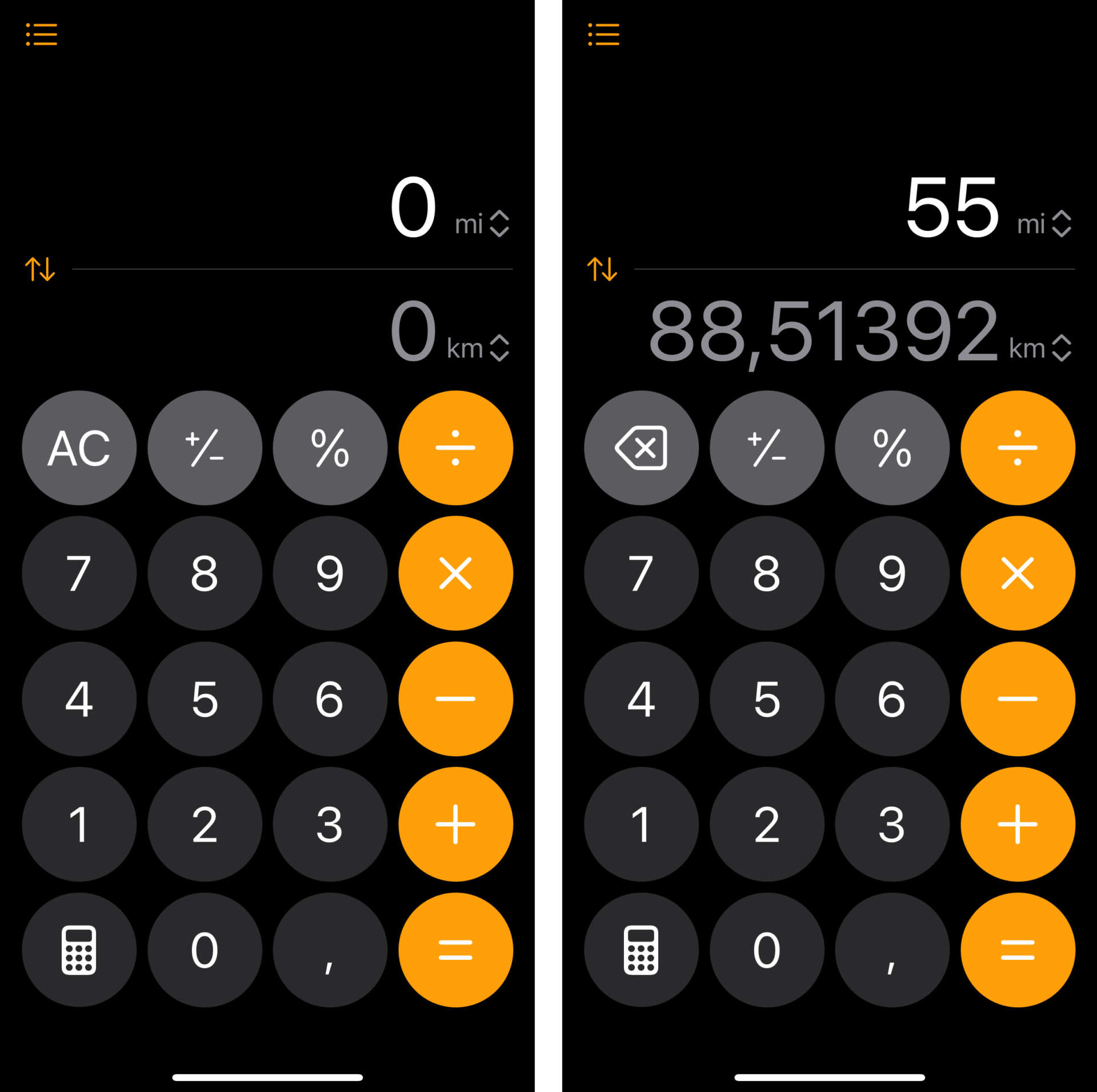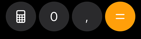 La schermata della Calcolatrice cambia in modo da ospitare due righe per i due valori, quello da convertire e quello convertito. In ogni riga, sulla destra, è presente il simbolo dell’unità di misura o della valuta e, di fianco, un’icona con due frecce: una verso l’alto e l’altra verso il basso.