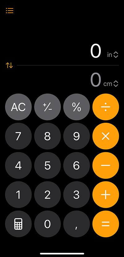Il campo di input e quello di output non sono predefiniti: basta un tocco su uno di essi per farlo diventare quello di input, cioè quello attivo in cui l’app inserisce il valore che digitiamo. L’altro diventa automaticamente quello in cui l’app Calcolatrice di iOS 18 visualizza la conversione. È possibile anche commutare tra i due facendo tap sulle due frecce a sinistra del campo. Il campo attivo presenta le cifre in evidenza, in bianco, mentre quello in cui viene visualizzata la conversione le presenta in una tonalità di grigio.