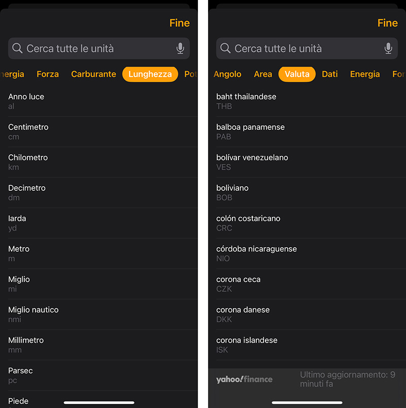 Nella parte superiore del menu Conversione, possiamo scorrere le categorie per individuare quella che ci interessa. Troviamo tutte le più diffuse: Lunghezza, Area, Volume, Peso, Temperatura e così via. Tra queste, c’è anche Valuta, per la conversione tra monete di Paesi diversi.