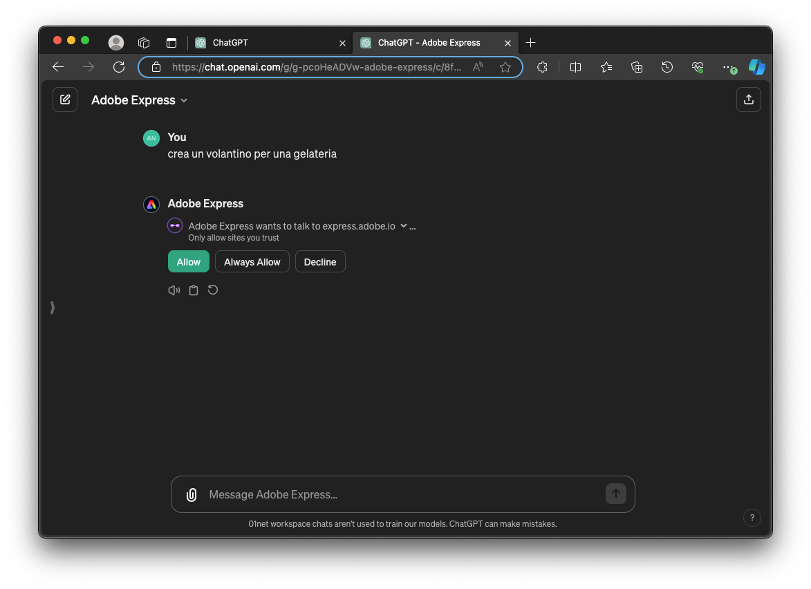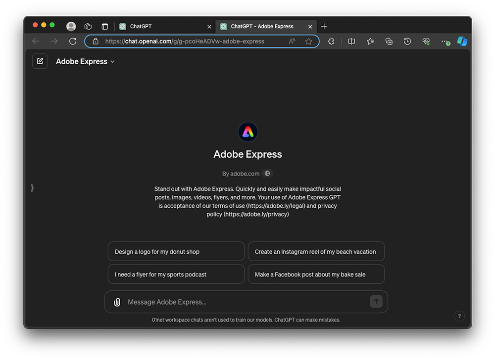 ChatGPTUna volta aperto Adobe Express GPT nella familiare interfaccia della chat di ChatGPT, abbiamo innanzitutto la possibilità – se lo preferiamo – di consultare, mediante gli appositi link, i termini di utilizzo e l’informativa sulla privacy del GPT, dato che il suo utilizzo da parte dell’utente ne implica l’accettazione.