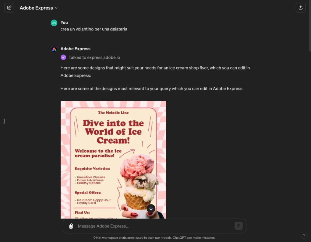 Adobe Express ChatGPTNel nostro esempio, abbiamo utilizzato un prompt molto sintetico e minimalista (“crea un volantino per una gelateria”). Possiamo però elaborare un prompt che indichi delle preferenze più specifiche.