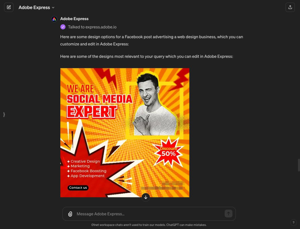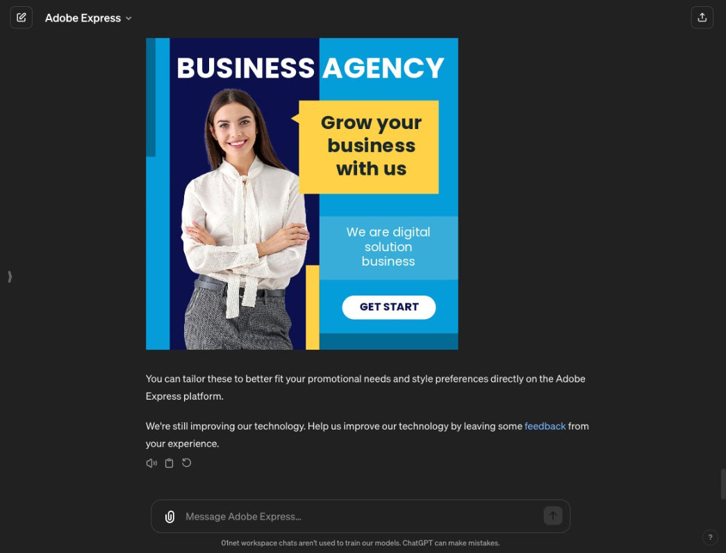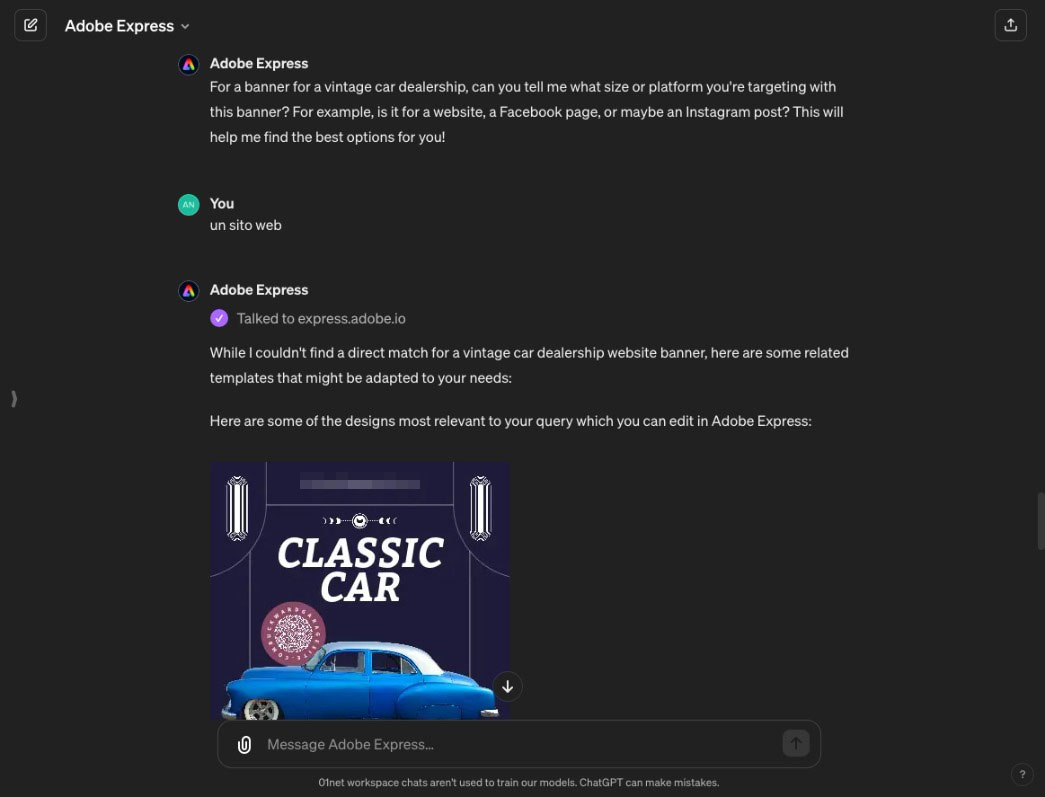Adobe Express ChatGPTIl GPT potrebbe, in alcuni casi, chiederci ulteriori chiarimenti, per trovare un design più adeguato: ad esempio, alla nostra generica richiesta di creare un banner pubblicitario per una rivendita di auto d’epoca, il custom GPT ci ha chiesto di specificare quale dimensione o piattaforma, se ad esempio fosse per un sito web, una pagina Facebook o un post su Instagram.
