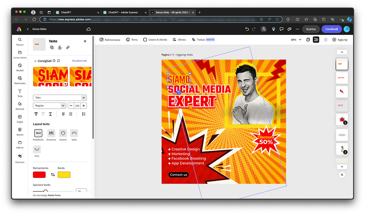 Adobe Express ChatGPTSia i contenuti testuali, sia le risposte del GPT, sembrano al momento essere solo in inglese, ma comunque le proposte di design sono solo una base di partenza: la personalizzazione avviene nell’ambiente di editing di Adobe Express.