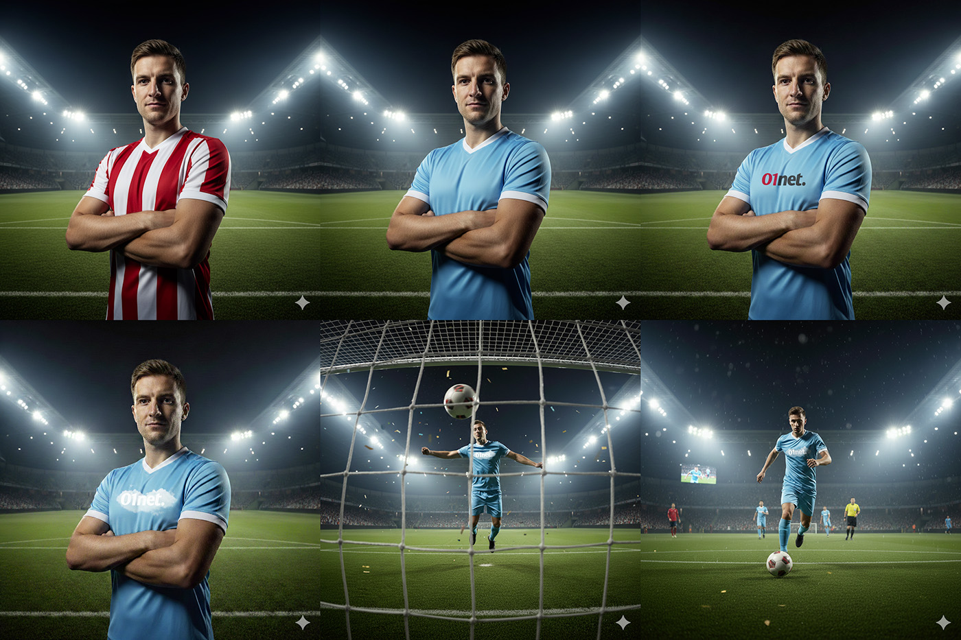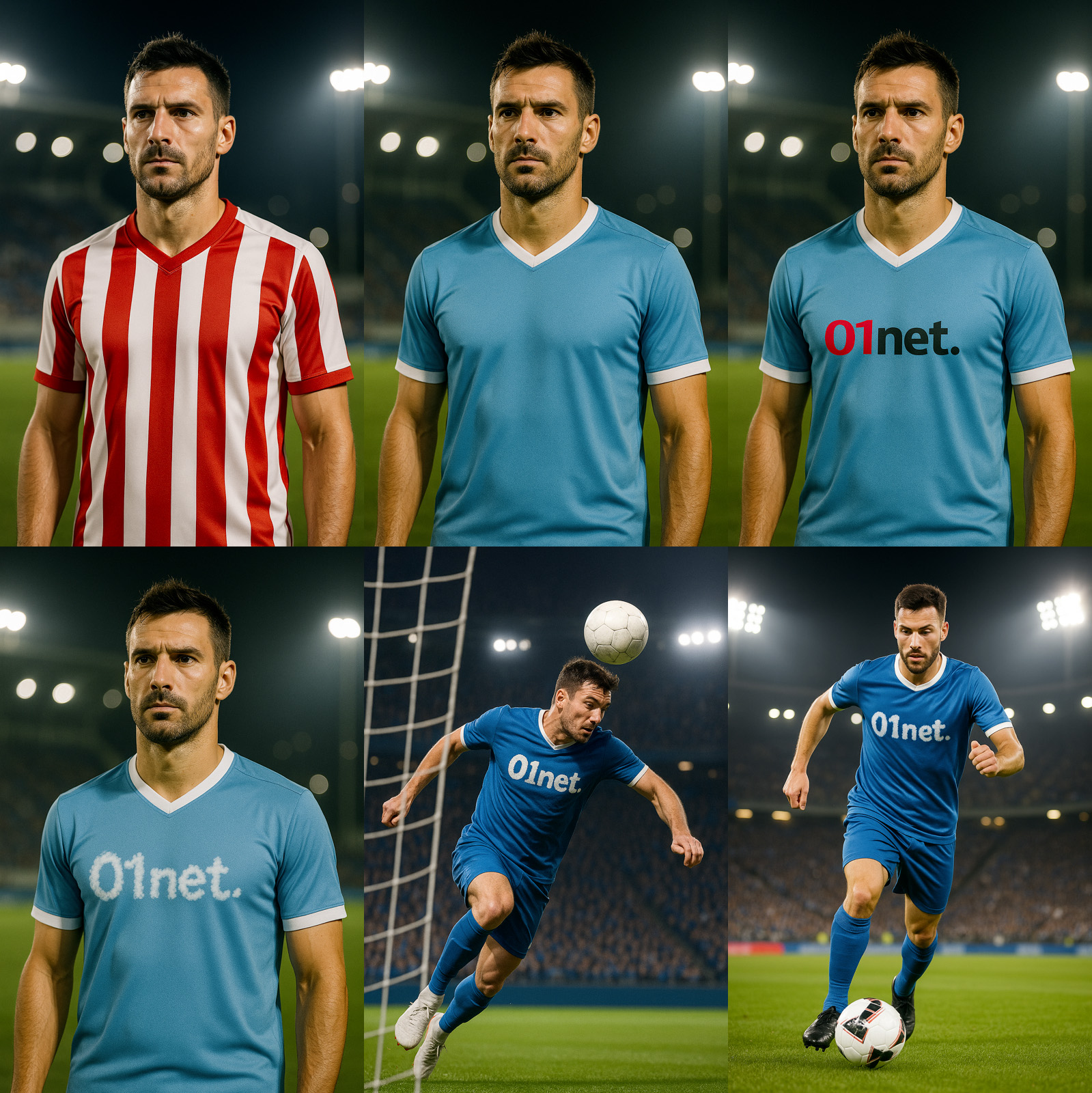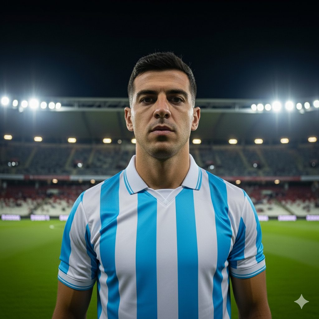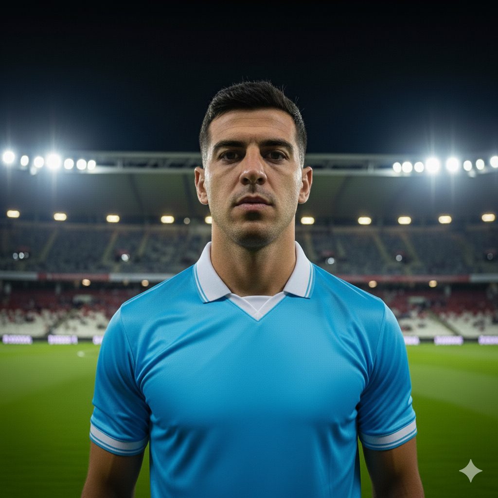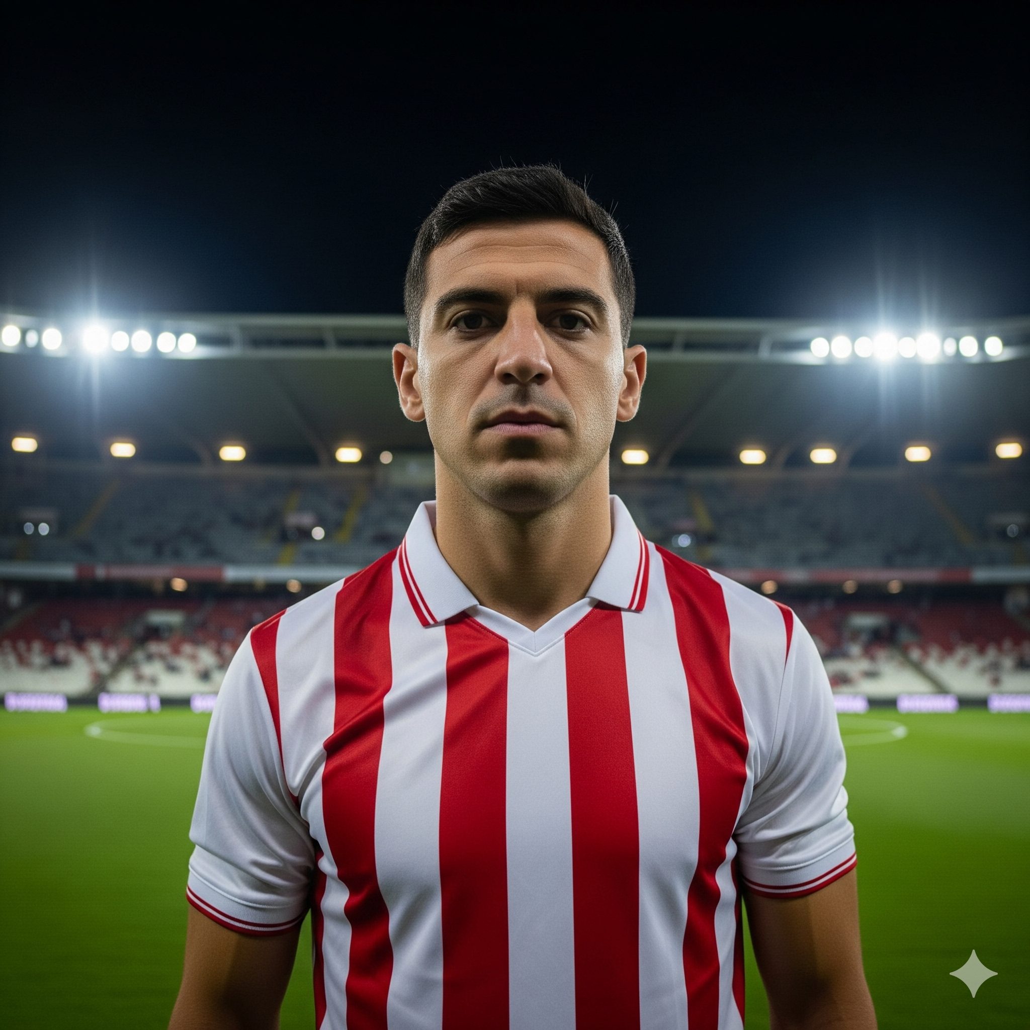 “Una foto realistica di un calciatore a mezzo busto. La maglietta della squadra è a strisce bianche e rosse verticali. Non aggiungere loghi né sponsor sulla maglia. Il calciatore è in posa, non in un’azione di gioco. L’ambientazione è in uno stadio di notte, con l’illuminazione artificiale”.