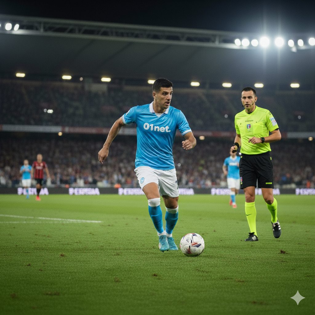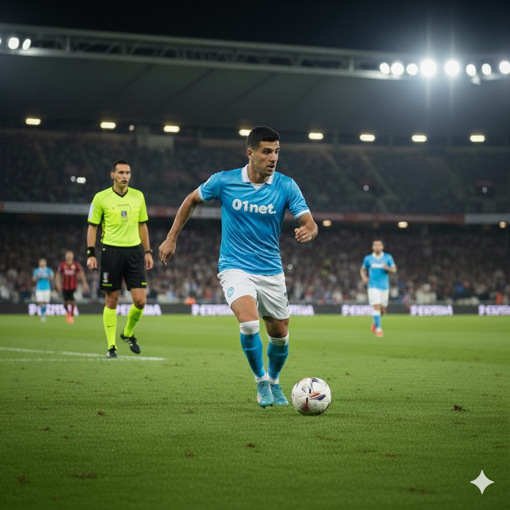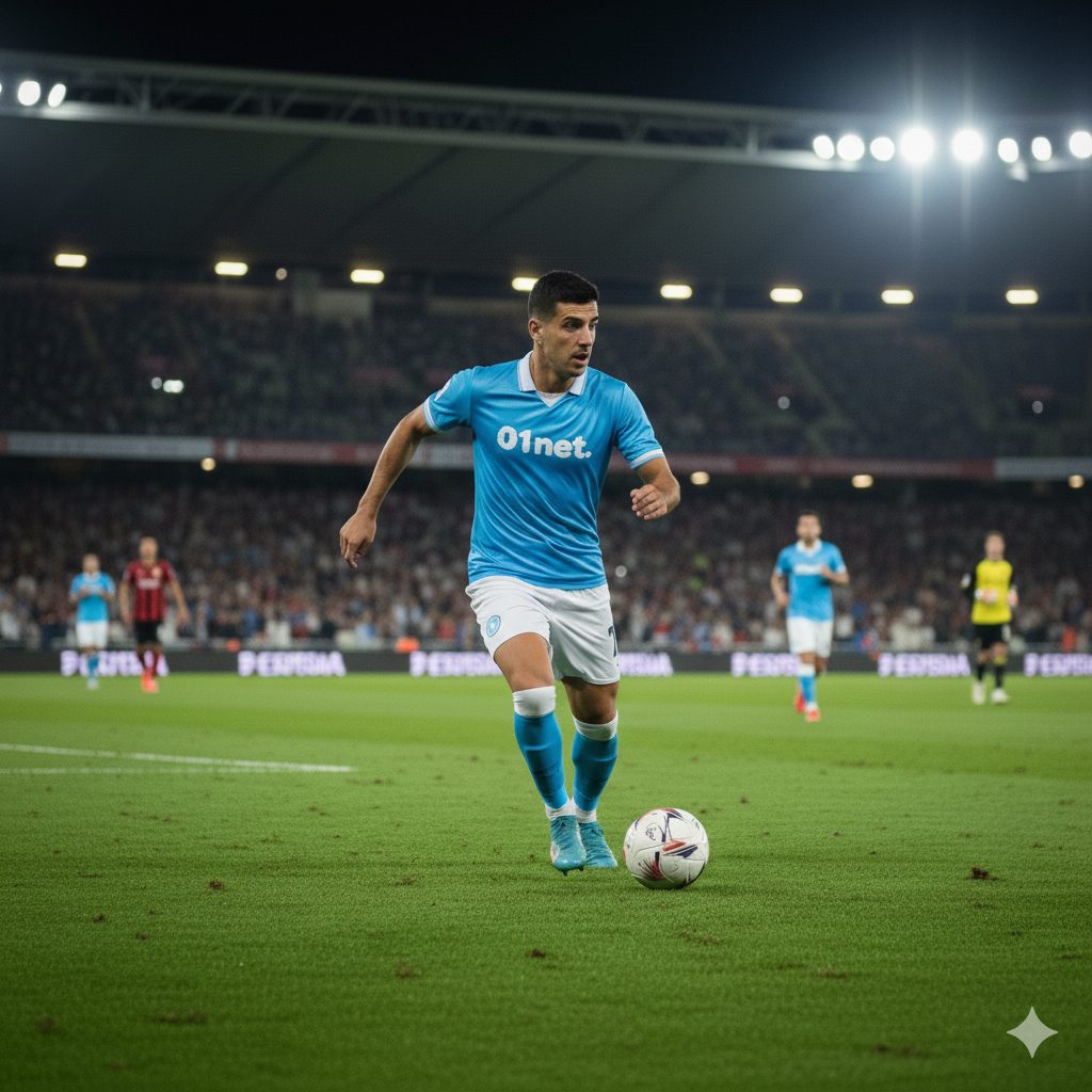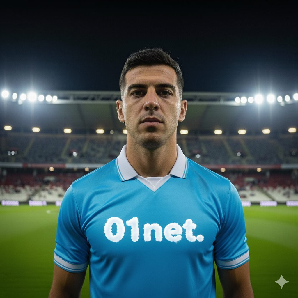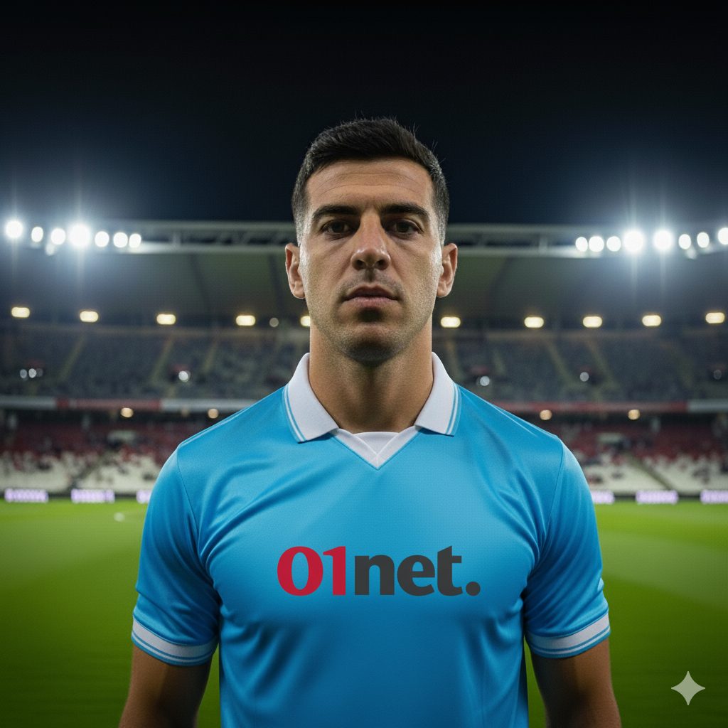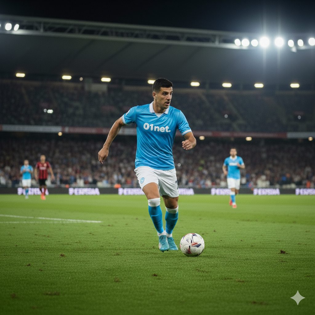 “Una foto realistica di un calciatore a mezzo busto. La maglietta della squadra è a strisce bianche e rosse verticali. Non aggiungere loghi né sponsor sulla maglia. Il calciatore è in posa, non in un’azione di gioco. L’ambientazione è in uno stadio di notte, con l’illuminazione artificiale”.