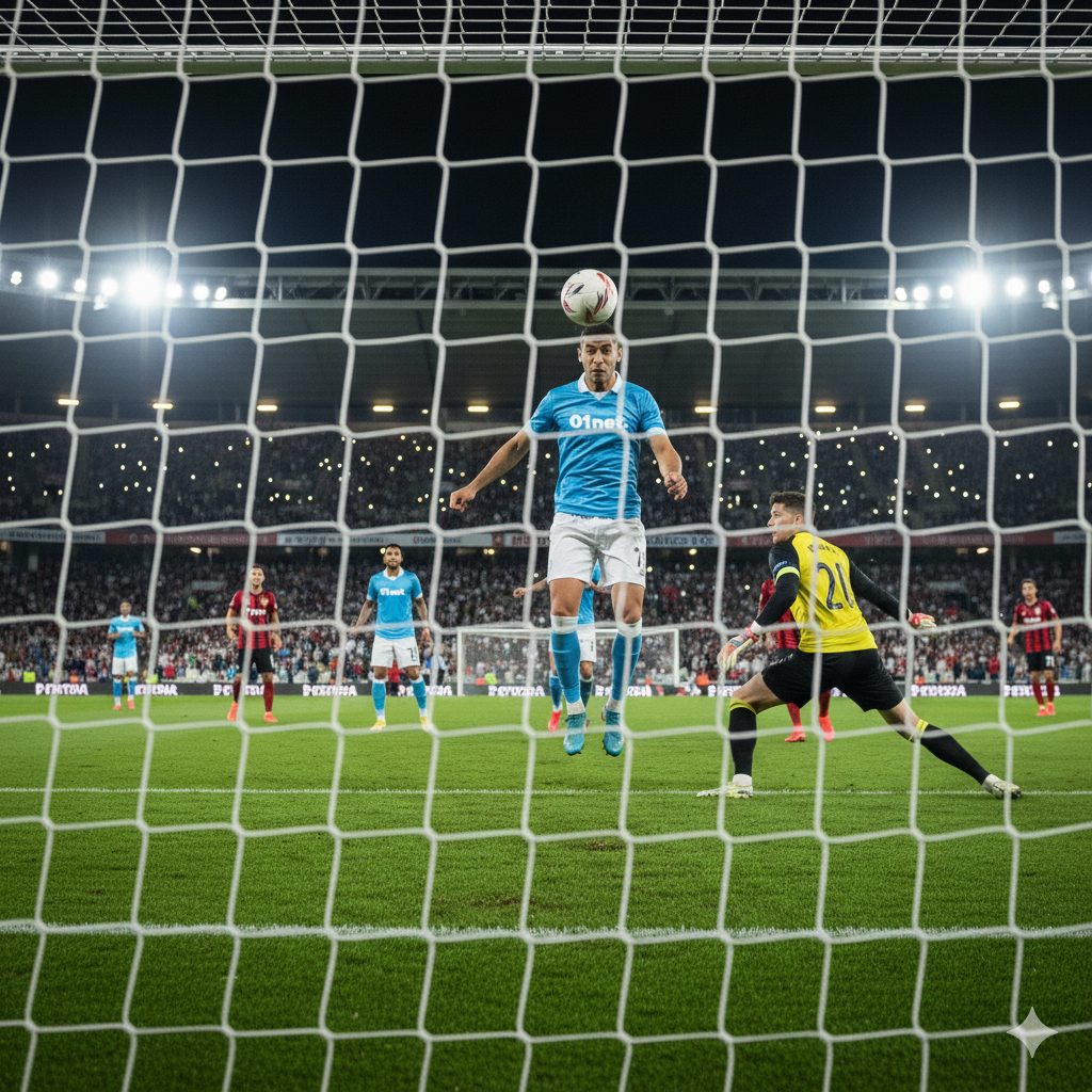 Inviamo dunque la richiesta: “Con lo stesso giocatore, crea una foto realistica di un’azione di gioco. L’ambientazione è sempre quella notturna di uno stadio con illuminazione artificiale. Gli spalti dello stadio sono riempiti dai tifosi. L’inquadratura è come se la foto fosse scattata da dietro la porta avversaria. Il giocatore sta segnando un gol di testa”.