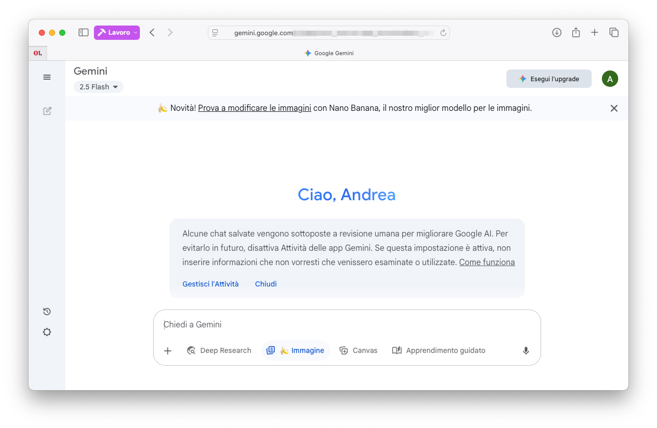 È possibile utilizzare Google Gemini 2.5 Flash Image Nano Banana nell’app Gemini, sia sul web che mobile. In questo primo periodo a ridosso del lancio, nell’interfaccia dell’app Gemini viene mostrato un banner che informa della disponibilità del nuovo modello e, nella casella del prompt, il tasto Immagine è affiancato dall’icona della banana.