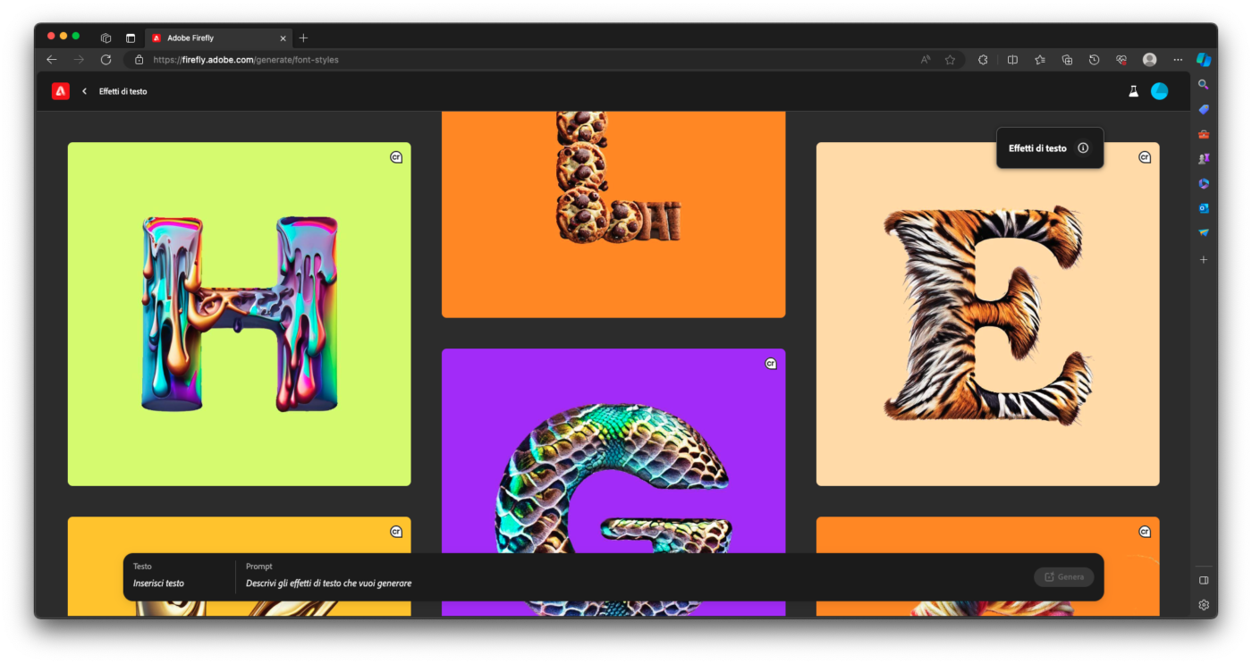 Colleghiamoci dunque alla web app di Adobe Firefly e, nella home page, facciamo clic sul riquadro Effetti di testo.