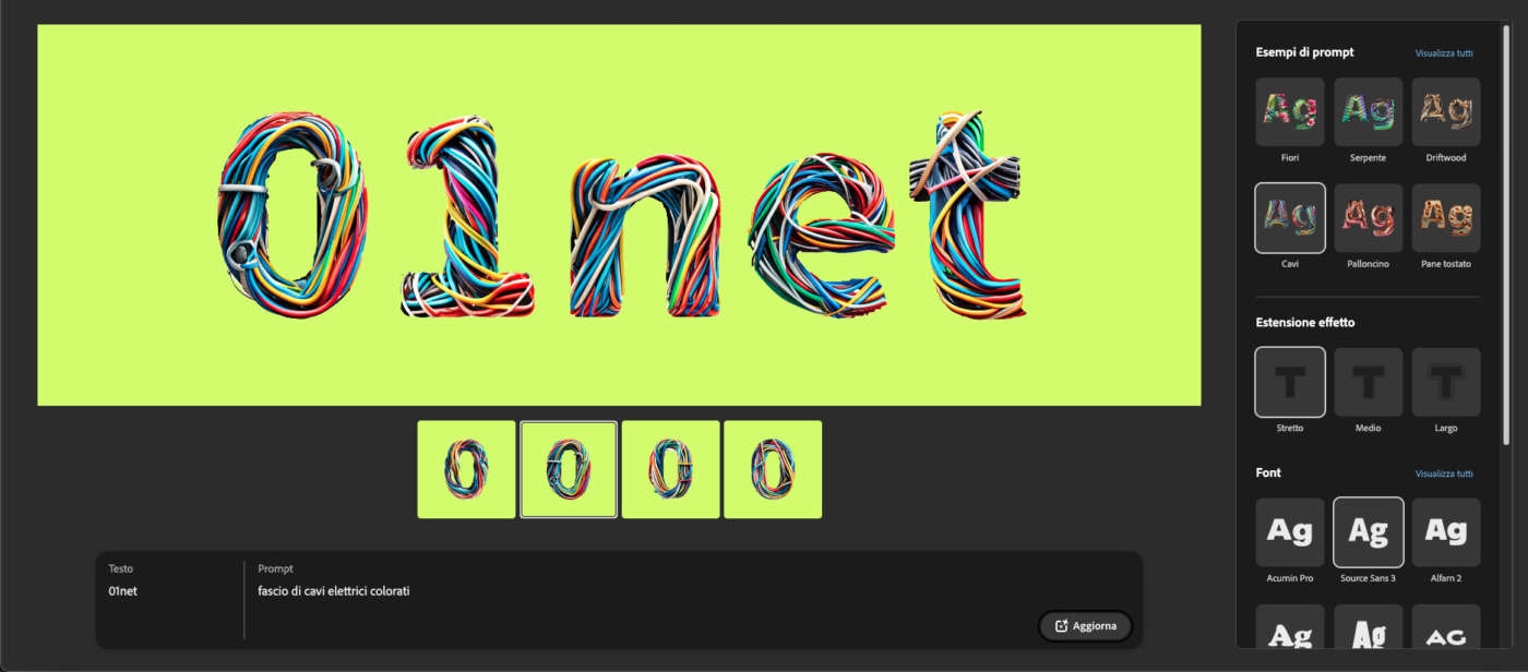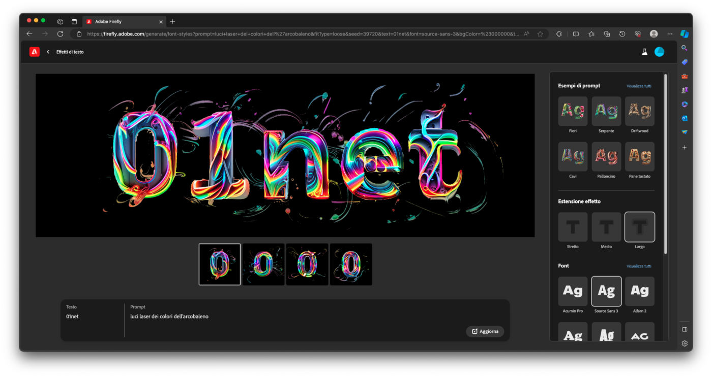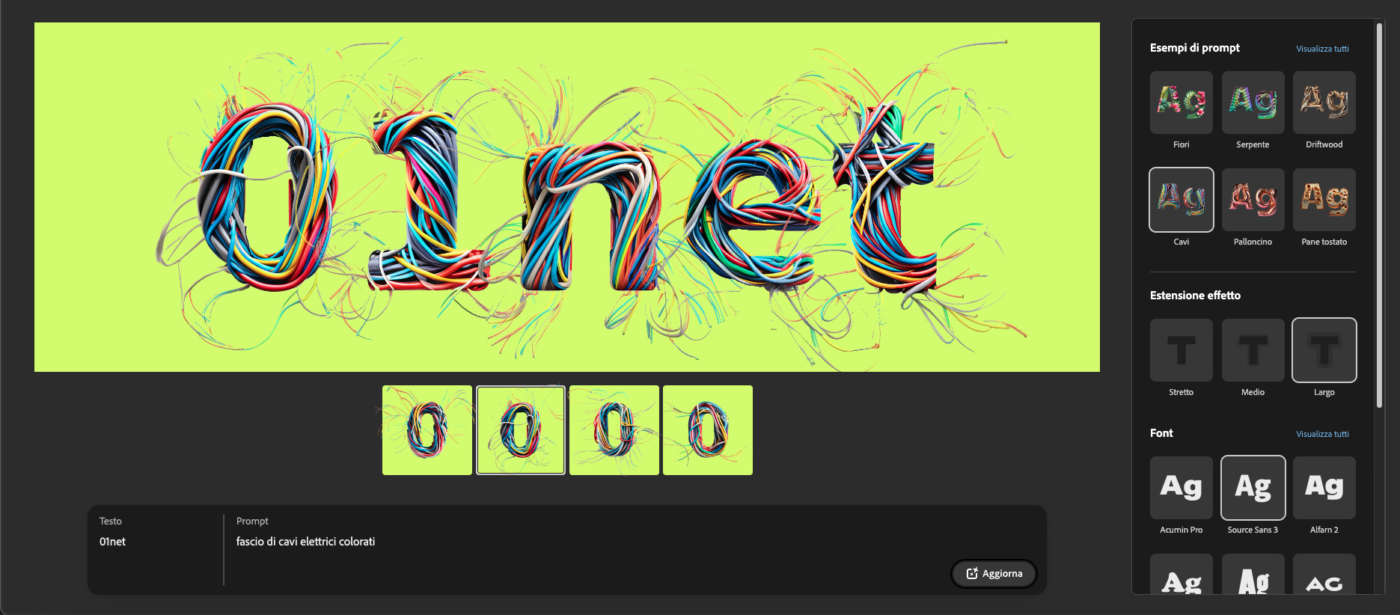 La pagina di editing della funzionalità Effetti di testo di Adobe Firefly è composta da un’area principale – che include le anteprime delle quattro immagini generate, l’anteprima più grande di quella selezionata e le caselle di input del testo e del prompt – e una colonna laterale in cui sono presenti gli strumenti e le opzioni di personalizzazione.