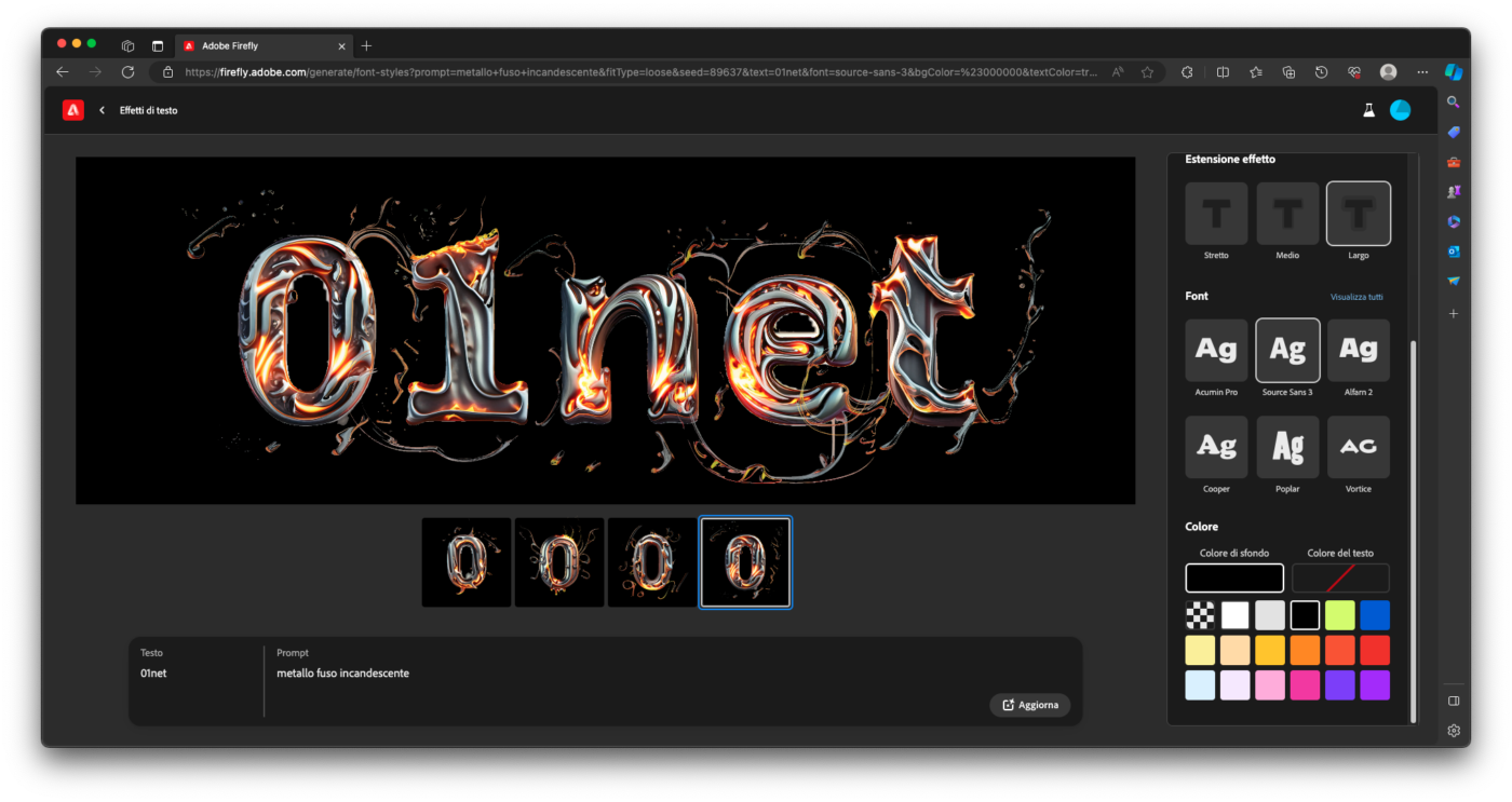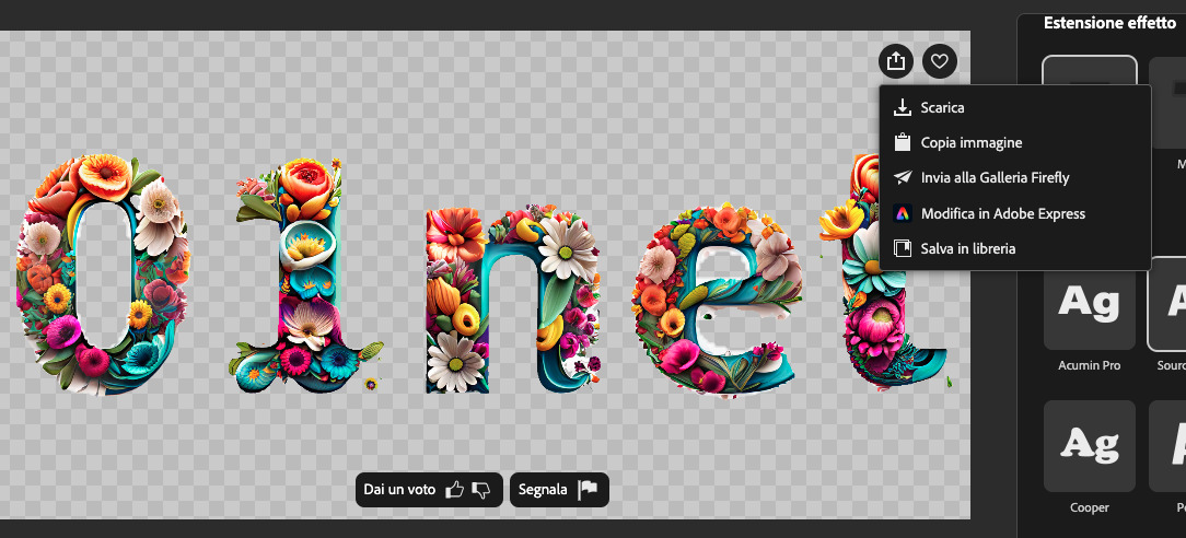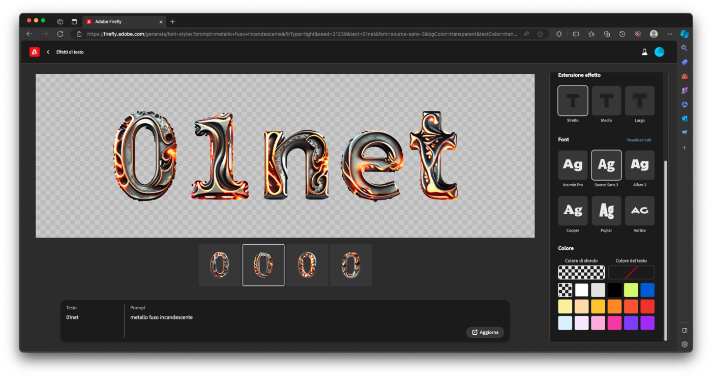 Infatti, se lo sfondo è trasparente, Adobe Firefly genererà un file PNG con trasparenza che potremo poi elaborare in post-produzione con maggiore flessibilità. Viceversa, se selezioniamo un colore di sfondo nella funzione Effetti di testo, l’immagine sarà generata in formato JPEG con quello selezionato come colore di background.